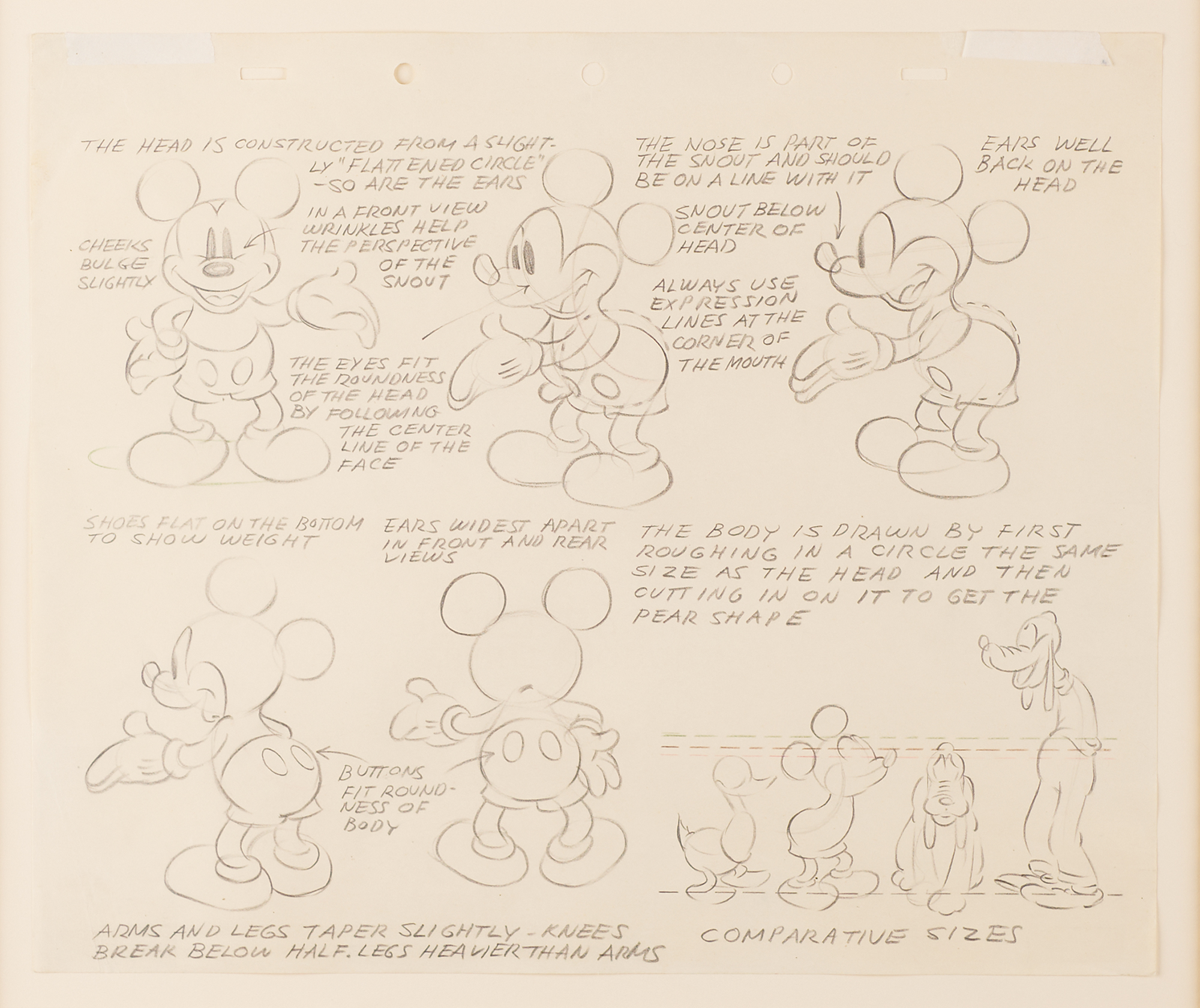 (Walt Disney Studios, 1937) Original preliminary model sheet drawing of Mickey Mouse created as an artist reference for the Walt Disney Studios art department. Accomplished in graphite on untrimmed 12 x 10 animation paper, the model drawing features five matching full-figure sketches of Mickey, each showing him smiling, his right hand on his hip, and his left hand in the air, all of which are surrounded by artist instructions in pencil, which read, in part: “The head is constructed from a slightly ‘flattened circle’ – so are the ears,” “Cheeks bulge slightly,” “The eyes fit the roundness of the head by following the center line of the face,” “Arms and legs taper slightly – knees break below half, legs heavier than arms.” Of further interest is a “Comparative Sizes” legend to the lower right that contains rough size sketches of Donald Duck, Mickey Mouse, Pluto, and Goofy. Images range in size from 1 x 1.5 (Donald Duck) to 2.75 x 3.5, with a mat opening of 12.75 x 11. Cloth-matted and framed to an overall size of 20.75 x 18.75. In fine condition.