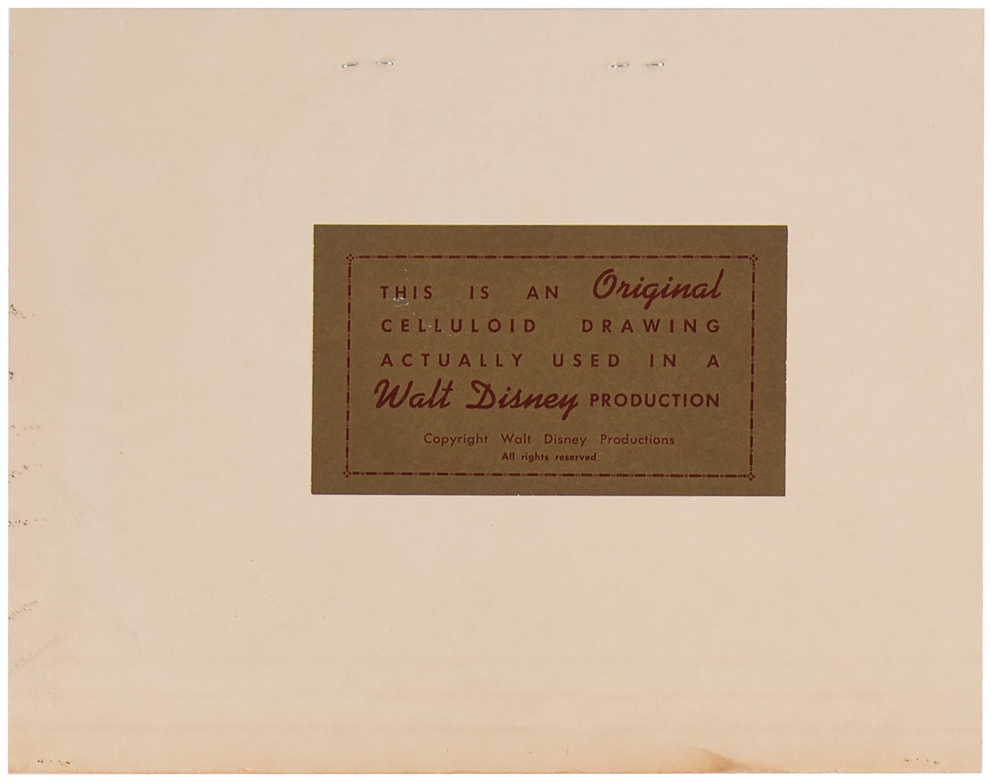 (Walt Disney Studios, 1955) Original production cels of a Siamese cat and a goldfish from Lady and the Tramp, picturing one of the devious cats — either Si or Am — emerging from below a curtain with claws as it stalks the unsuspecting family fish. Character images measure 2.5 x 2.5 (goldfish) and 6 x 2.75 (cat and curtain), with overall dimensions of 9 x 7. The cel is stapled to its original cardstock mount, the reverse of which bears a golden Walt Disney Productions label that reads: “This is an original celluloid drawing actually used in a Walt Disney production.” In fine condition, with evenly trimmed edges.