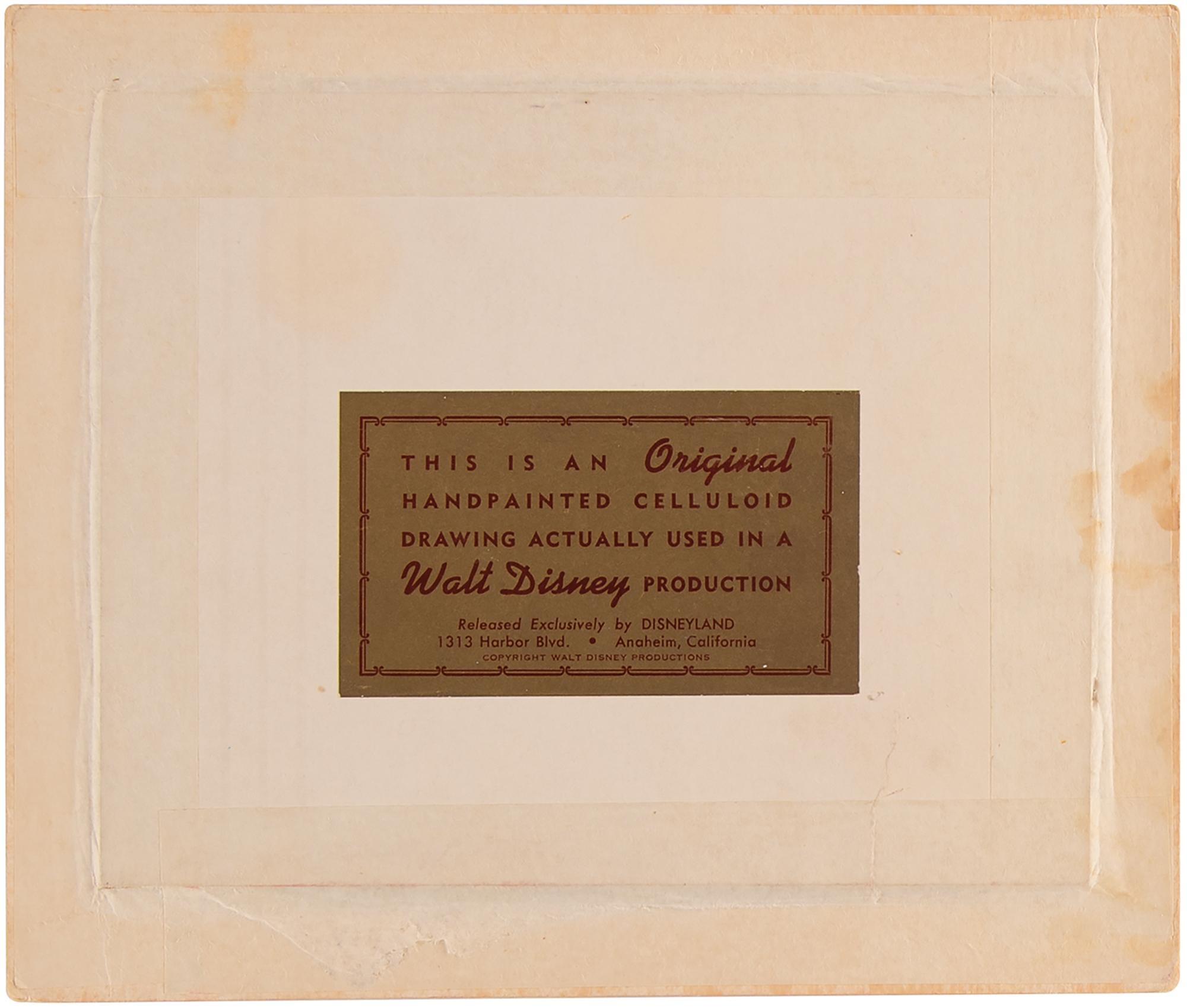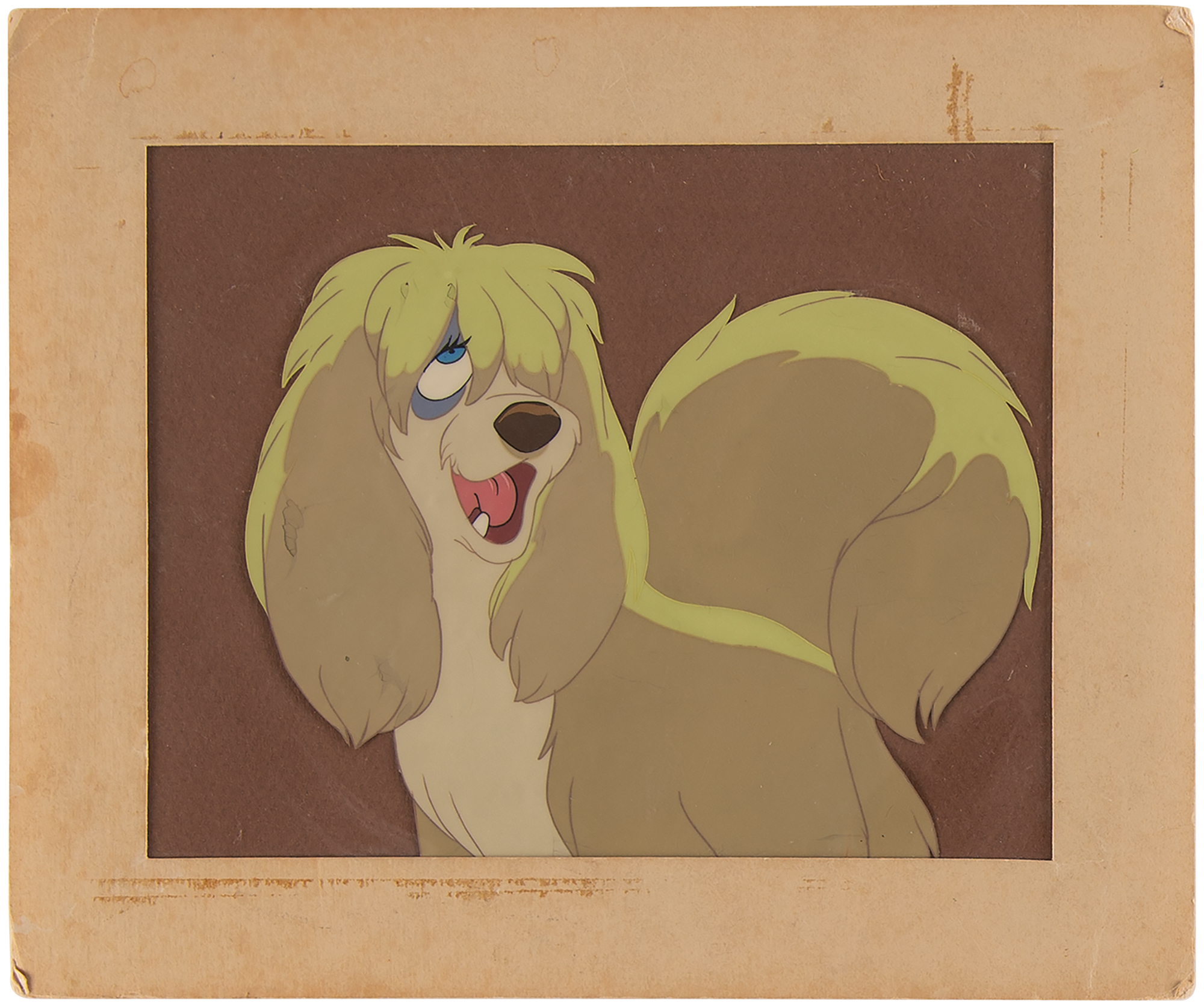 (Walt Disney Studios, 1955) Original production cel of Peg from Lady and the Tramp, depicting the sassy Pekingese speaking in a three-quarter-length pose. Image measures 6.25 x 4.75, with a mat opening of 7.25 x 5.75. The cel is displayed within its original 9.5 x 8 presentation mat, the reverse of which bears a golden Walt Disney Productions label that reads: “This is an original handpainted celluloid drawing actually used in a Walt Disney production.” In fine condition, with some wear and stains to the mat.