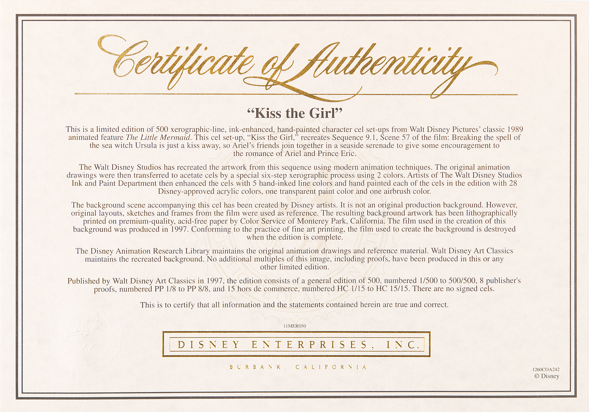 Accompanied by a detailed certificate of authenticity from Disney Enterprises, which reads, in part: “This is a limited edition of 500 xerographic-line, ink-enhanced, hand-painted character cel set-ups from Walt Disney Pictures’ classic 1989 animated feature The Little Mermaid. This cel set-up, ‘Kiss the Girl,’ recreates Sequence 9.1, Scene 47 of the film: Breaking the spell of the sea witch Ursula is just a kiss away, so Ariel’s friends join together in a seaside serenade to give some encouragement to the romance of Ariel and Prince Eric.