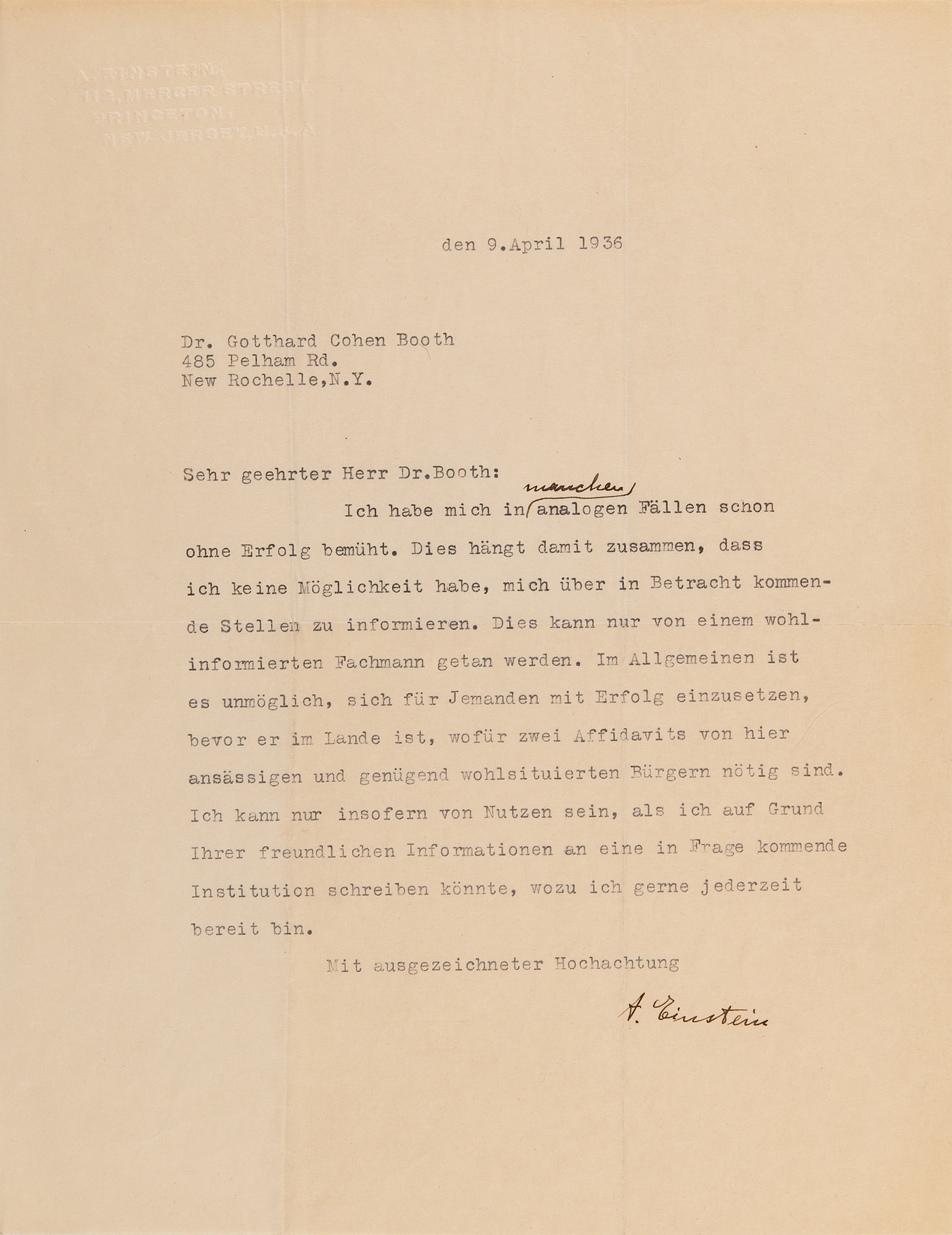 TLS in German, signed “A. Einstein,” one page, 8.5 x 11, blindstamped personal Princeton letterhead, April 9, 1936. Letter to Dr. Gotthard Cohen Booth, lending some advice relative to immigration. In full (translated): "I have already made unsuccessful efforts in many analogous cases. This is related to the fact that I have no way to obtain information about relevant positions. This can only be done by a well-informed specialist. In general, it is impossible to advocate successfully on anyone’s behalf before that person is in the country, for which two affidavits from resident and sufficiently well-off citizens are necessary. I can be useful only insofar as I could write to a suitable institution, on the basis of your friendly information, which I will be glad to do at any time." Einstein adds a single word to the first line in his own hand. In fine condition.