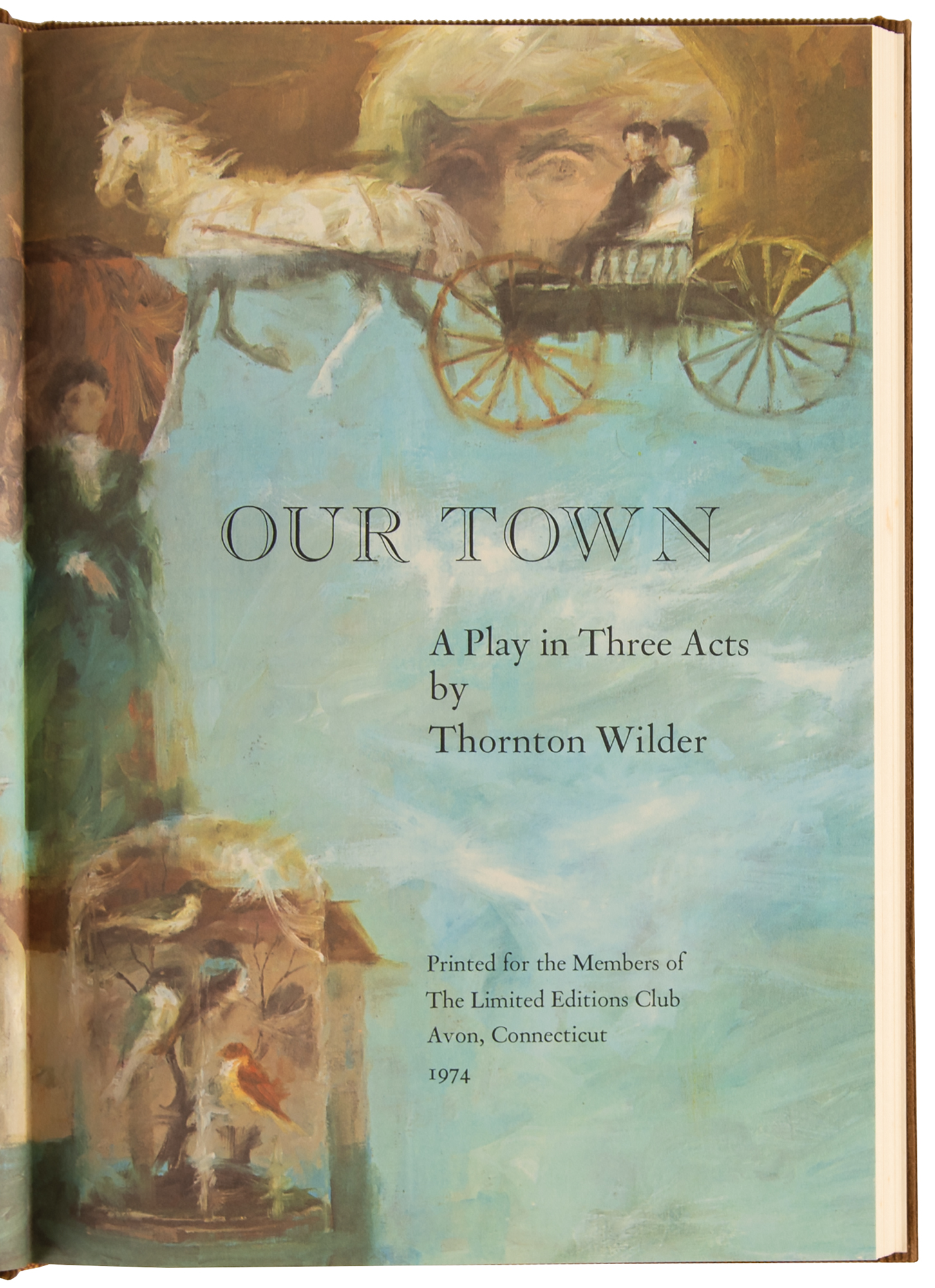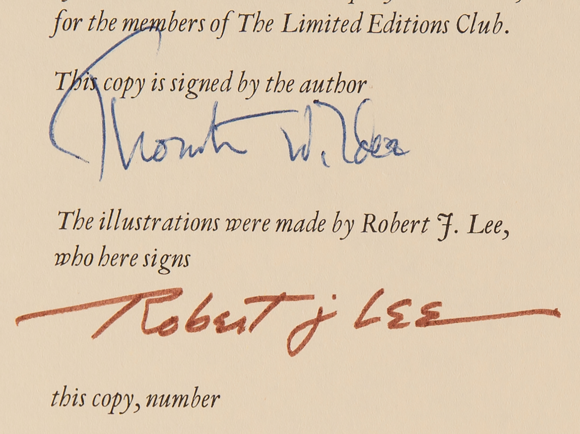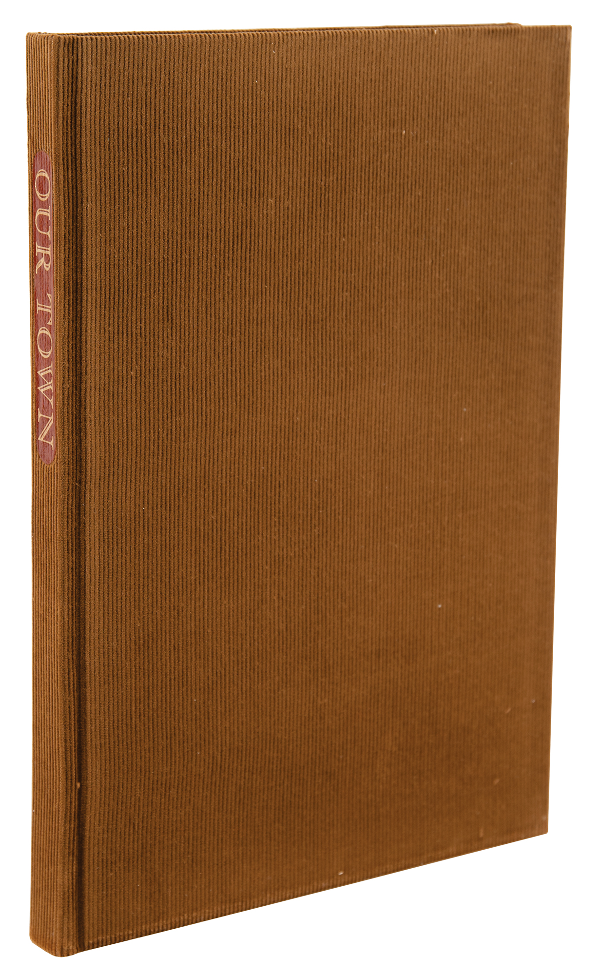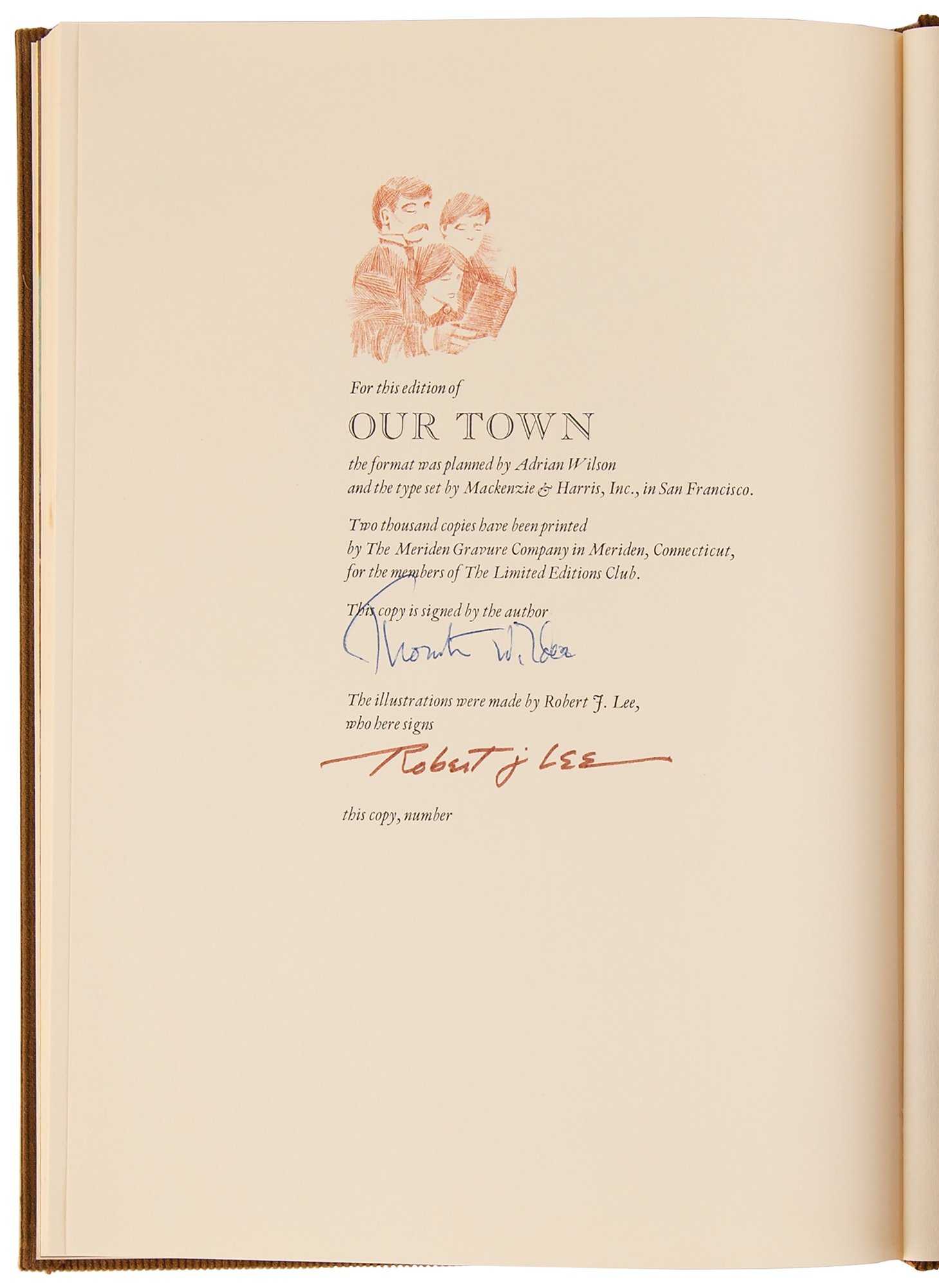 Signed book: Our Town: A Play in Three Acts. Limited illustrated edition printed for the Members of The Limited Edition Club, unnumbered presentation copy of an edition of 2000. Cardavon Press, 1974. Attractive tan corduroy hardcover (with original glassine dust jacket) and slipcase, 8.75 x 12.5, 118 pages. Signed on the colophon in ballpoint by Thornton Wilder, as well as by the book's illustrator, Robert J. Lee. In fine condition, with some wear to the glassine dust jacket, and light spotting to the textblock.
