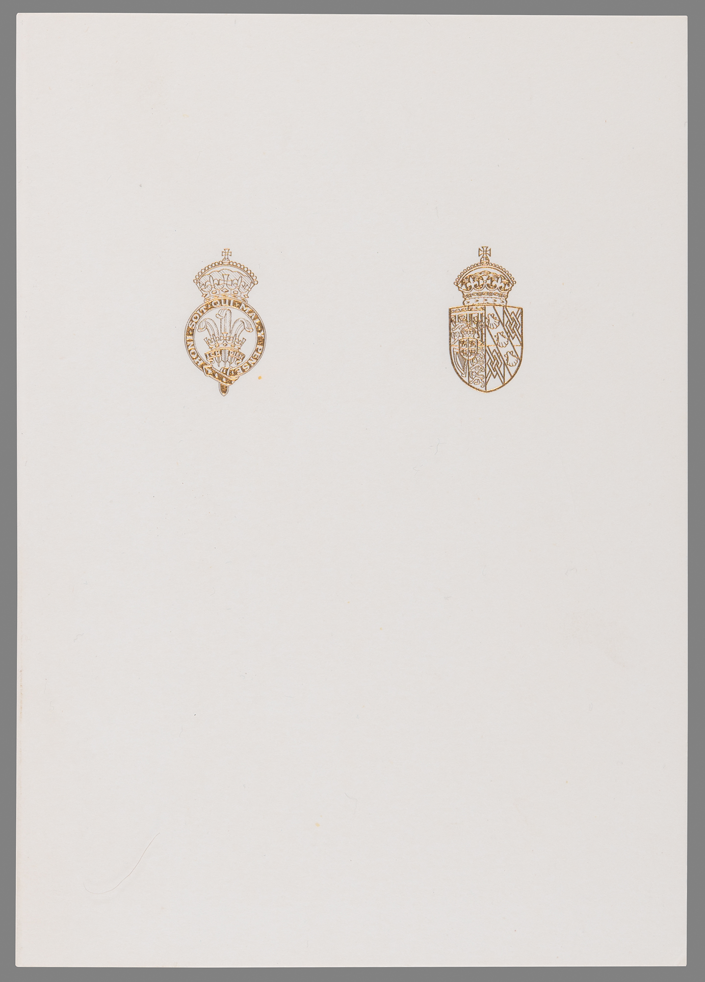 Desirable Christmas card from 1985, embossed on the front with the Prince of Wales’s feathers and Order of the Garter motto and the Spencer family arms, measuring 10.25 x 7.25 open, featuring an affixed color portrait of the royal family with Prince Harry and Prince William riding a pony, signed and inscribed inside in fountain pen, "To you both—from Charles and" and "Diana." In very fine condition.