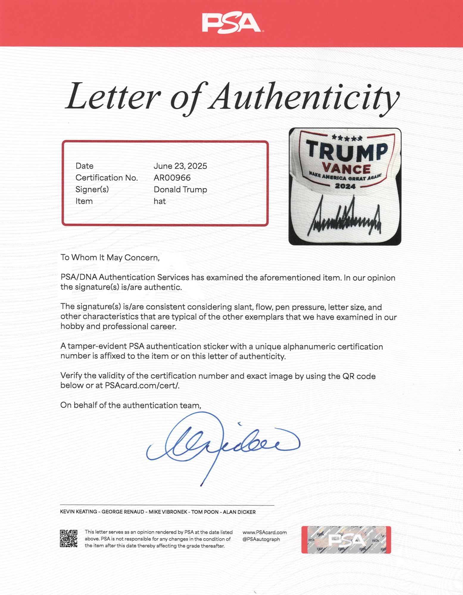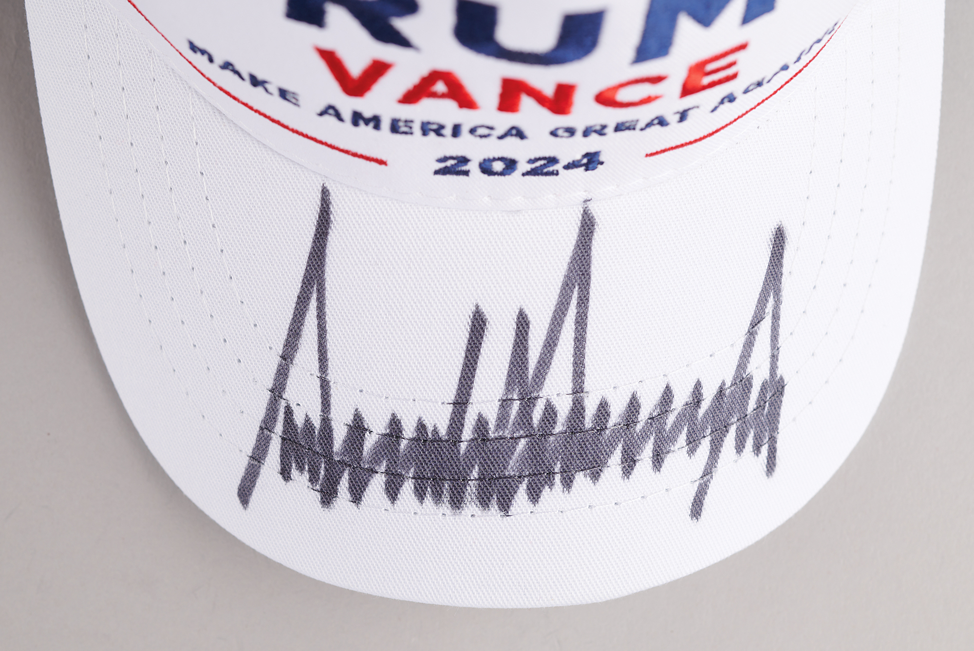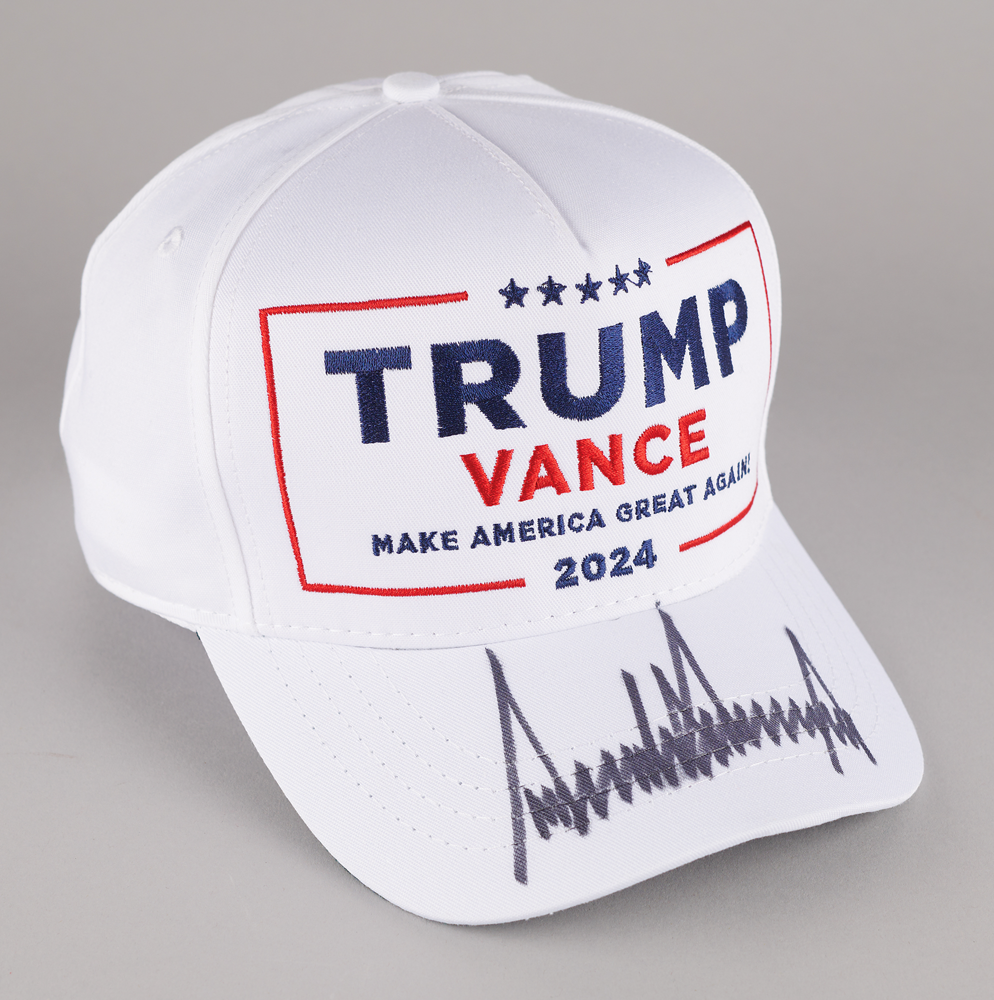 White adjustable baseball cap by Cali-Fame Headwear embroidered in blue and red, "Trump/Vance, Make America Great Again! 2024," signed on the bill in black felt tip by Donald Trump. In very fine condition, with a PSA/DNA label affixed under the bill. Accompanied by a full letter of authenticity from PSA/DNA and a UV-protective acrylic display case.