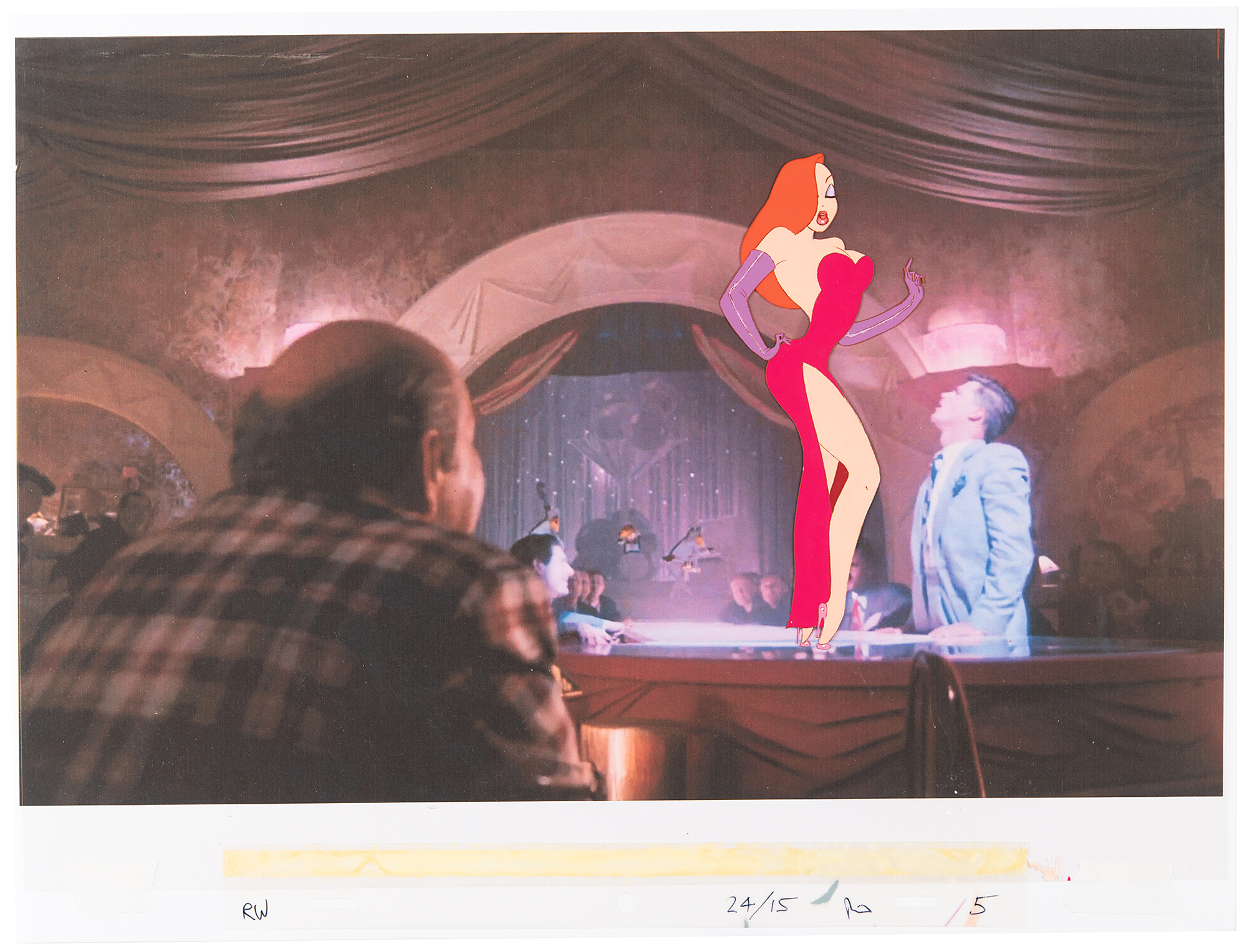 (Amblin/Walt Disney Studios, 1988) Original production cel Jessica Rabbit from Who Framed Roger Rabbit, showing the voluptuous redhead in an attractive full-figure pose. The cel is placed on a matching color print of the key background. Image measures 2.75 x 6.75, with overall dimensions of 16.75 x 12.75. In fine condition, with some creasing to lower right area, partially touching Jessica’s dress and left heel.