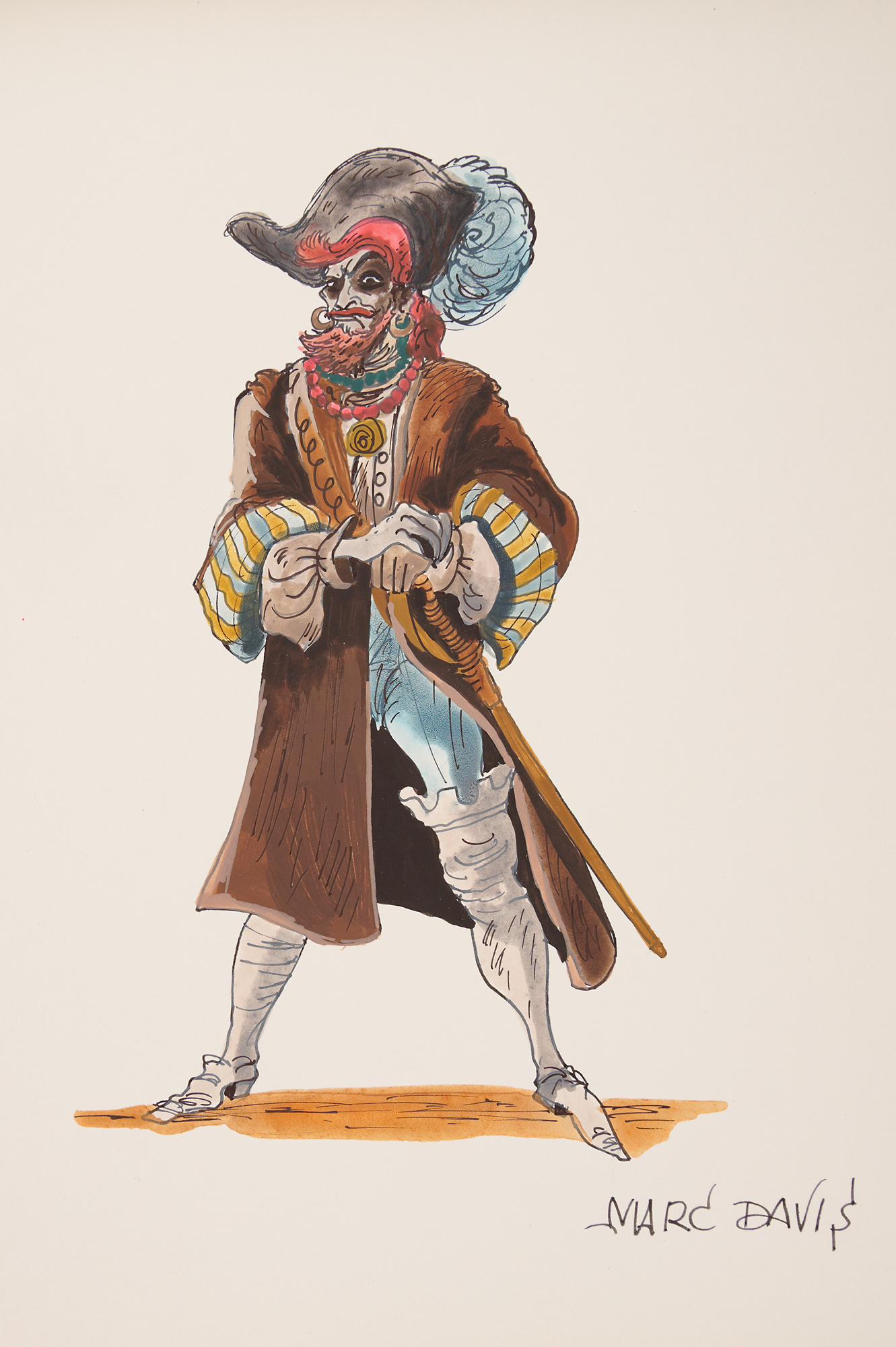 (Walt Disney Studios, 1967-1969) Desirable original concept painting attributed to Marc Davis for Disneyland's famous dark ride attraction, The Haunted Mansion, depicting bloodthirsty pirate Captain Bartholomew Gore. Accomplished in ink and watercolor on untrimmed 10 x 12 heavyweight art paper, the beautifully rendered work is signed in black felt tip by Davis. The reverse is stamped: "This material is the property of Walt Disney Productions." In fine condition.