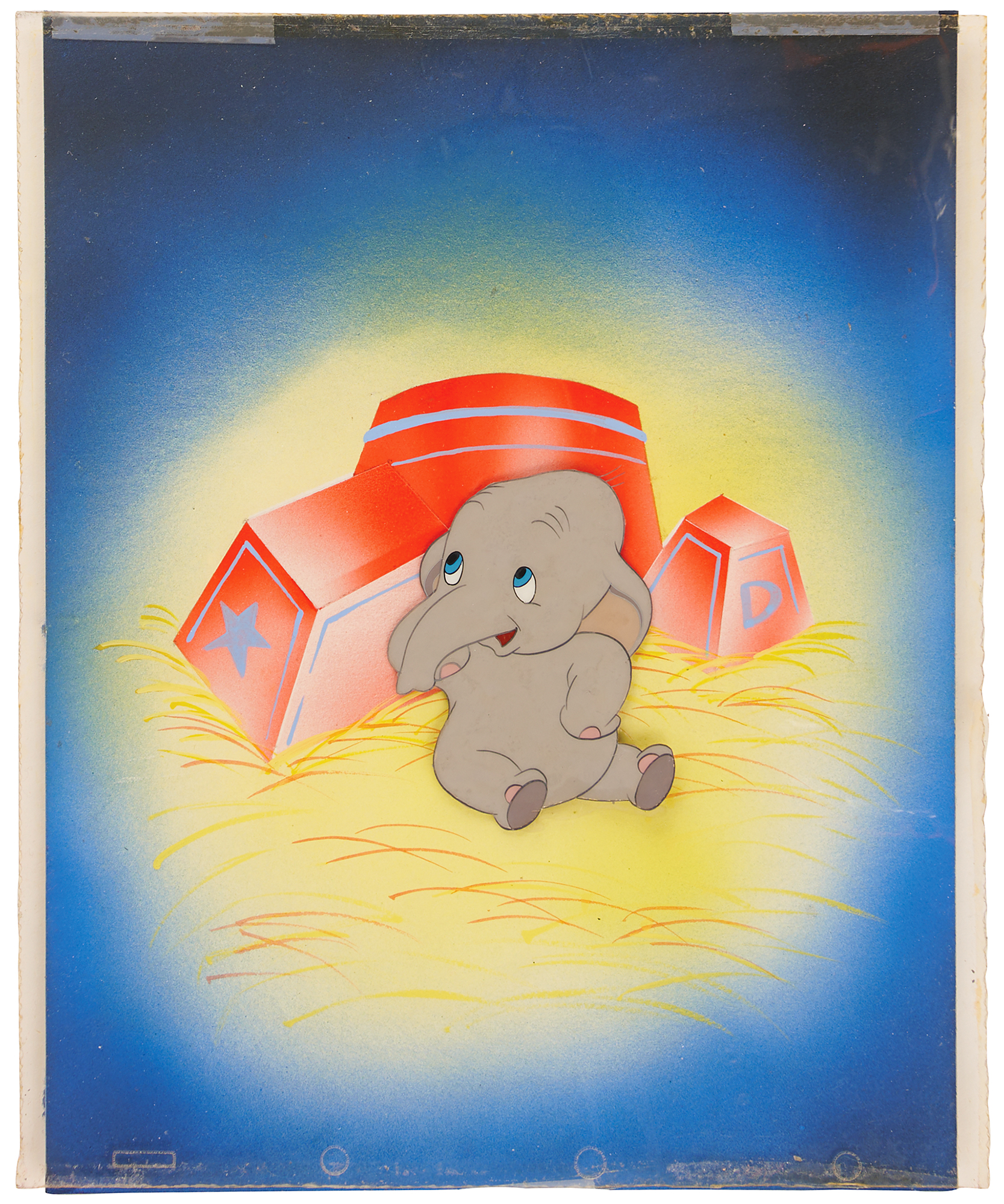 (Walt Disney Studios, 1941) Original production cel of Dumbo from the film of the same name, depicting the title character as a baby at the start of the film, shortly after being delivered into the elephant circus train car by the stork. The cel has been trimmed and applied to an attractive hand-painted background as prepared by Courvoisier Galleries for sale. Image measures 2.25 x 2.75, with an overall size of 7.5 x 9. The original Courvoisier Galleries label is no longer present. In fine condition. A charming original cel from the very first sequence to show Dumbo on screen.