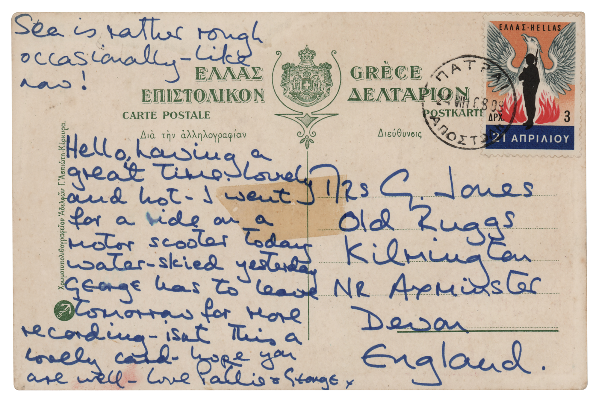 ALS from Pattie Boyd signed “Pattie & George,” penned on the back of a color 5.75 x 3.75 Greek postcard dated to 1968. The handwritten letter is addressed to Boyd’s mother and reads: “Hello, having a great time. Lovely and hot – I went for a ride on a motor scooter today, water-skied yesterday. George has to leave tomorrow for more recording – isn’t this a lovely card – hope you are well.” Boyd adds above, “Sea is rather rough occasionally – like now!” In fine condition, with an old tape stain at the center. Accompanied by a certificate of authenticity from Tracks. On August 17, 1968, George Harrison and Pattie Boyd flew to Greece for a brief holiday. They were accompanied on the trip by The Beatles’ assistant Mal Evans and were later joined by Twiggy and her boyfriend/manager, Justin de Villeneuve. As Boyd indicates, Harrison returned to London and EMI Studios to continue recording the Beatles' self-titled 1968 'White' album.