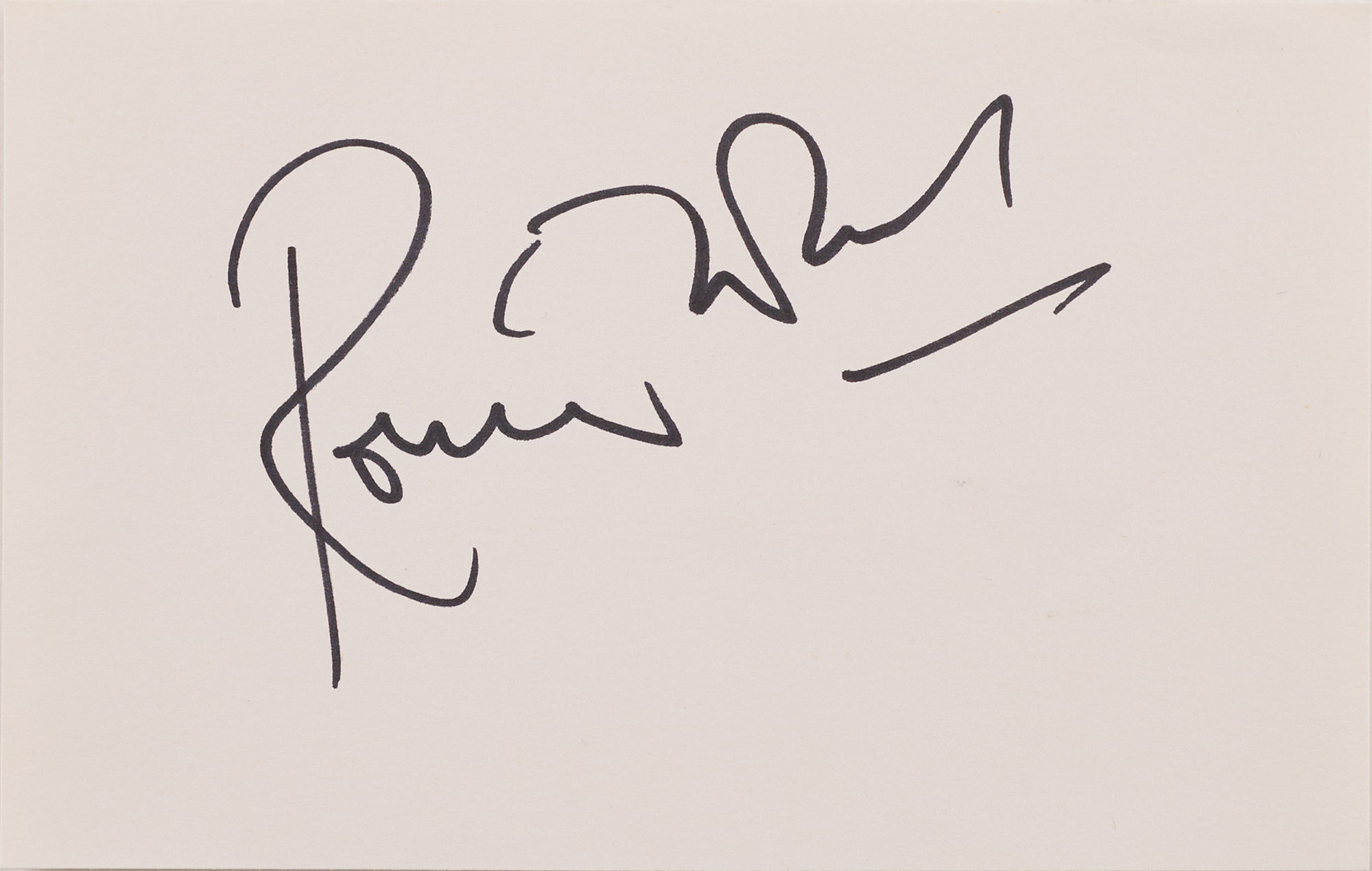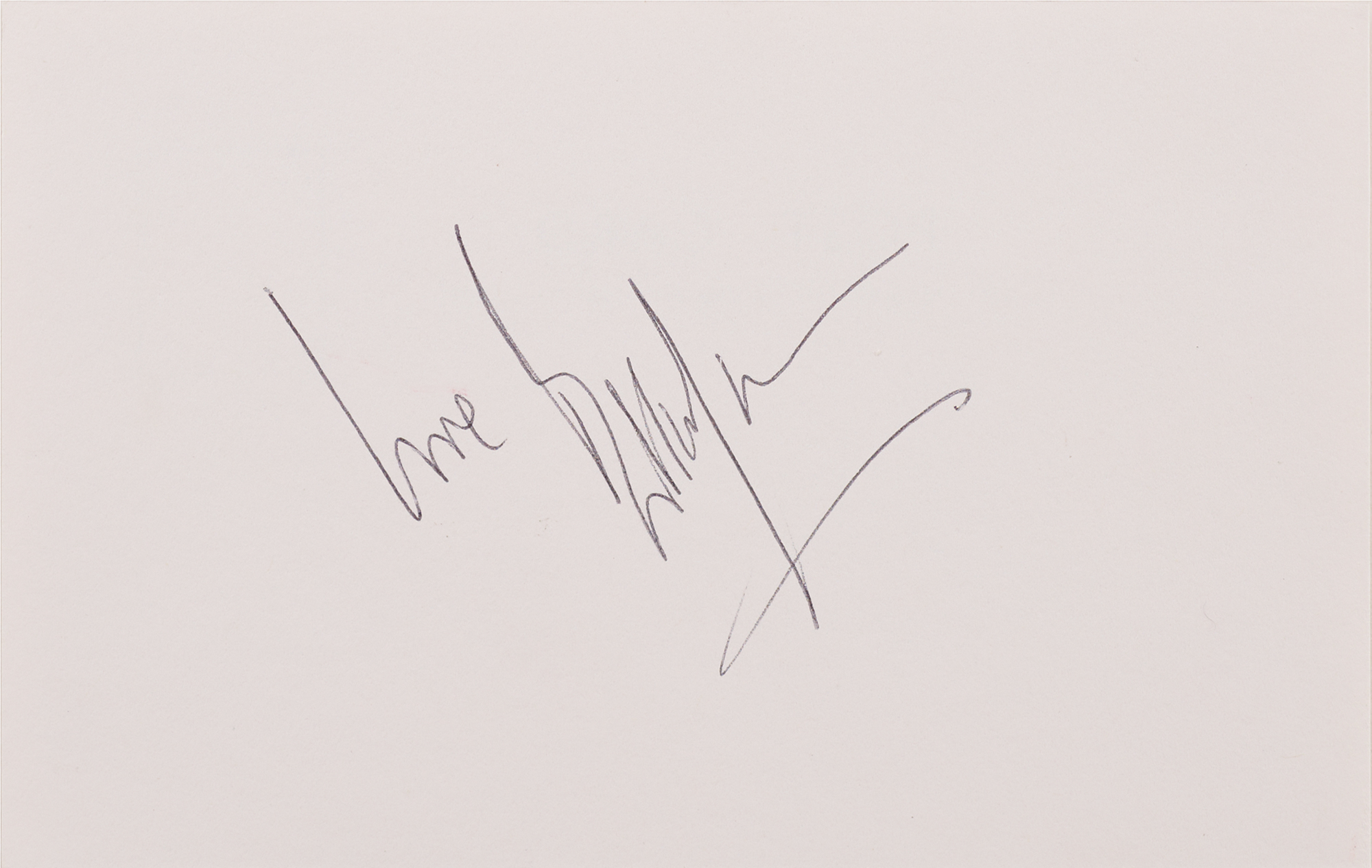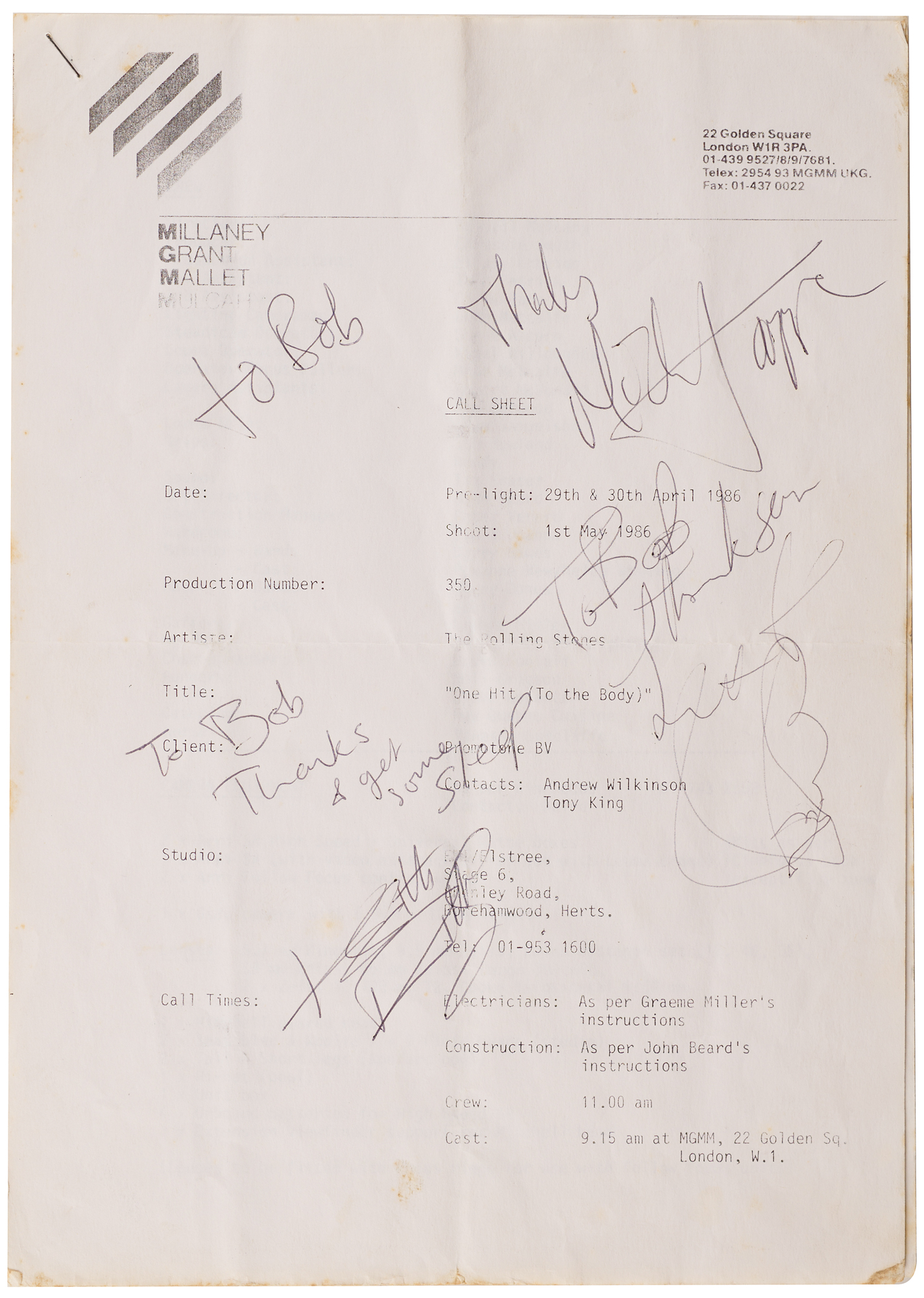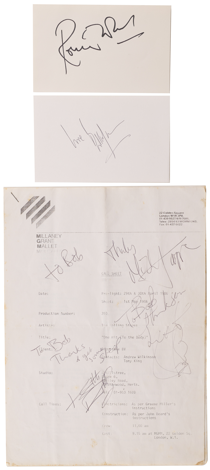 MGMM call sheet for the music video shoot of the Rolling Stones single ‘One Hit (To the Body),’ which took place at Elstree Studios in Borehamwood, Hertfordshire, England, on May 1, 1986. The call sheet, three pages, 8.25 x 11.75, is signed and inscribed on the front sheet in black ballpoint, “To Bob, Thanks, Mick Jagger,” “To Bob, Thanks & get some sleep, Keith Richards,” and “To Bob, thank you, love, Charlie Boy.” Includes two off-white 5.5 x 3.5 cards, one of which is signed in black ballpoint, “Love, Bill Wyman,” and the other is signed in black felt tip, “Ronnie Wood.” In fine condition, with intersecting folds to the call sheet. Accompanied by a certificate of authenticity from Tracks and by a letter from the wife of the original recipient: “The 3 autographs of Mick Jagger, Keith Richards and Charlie Watts on the Call Sheet for One Hit (To The Body) dated 1st May 1986, were dedicated to my late husband Robert Jones (Bob) when he worked with them on the shoot. He was an electrician (Sparks) with Pennine Lighting at that time under Graham Miller (Gaffer).”