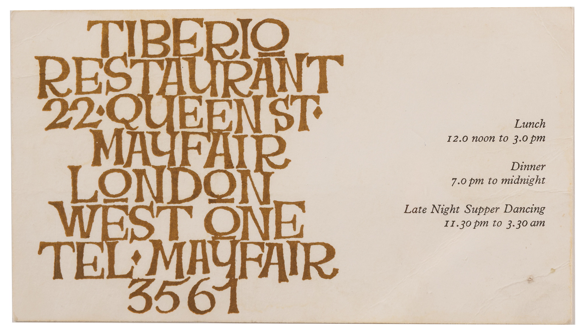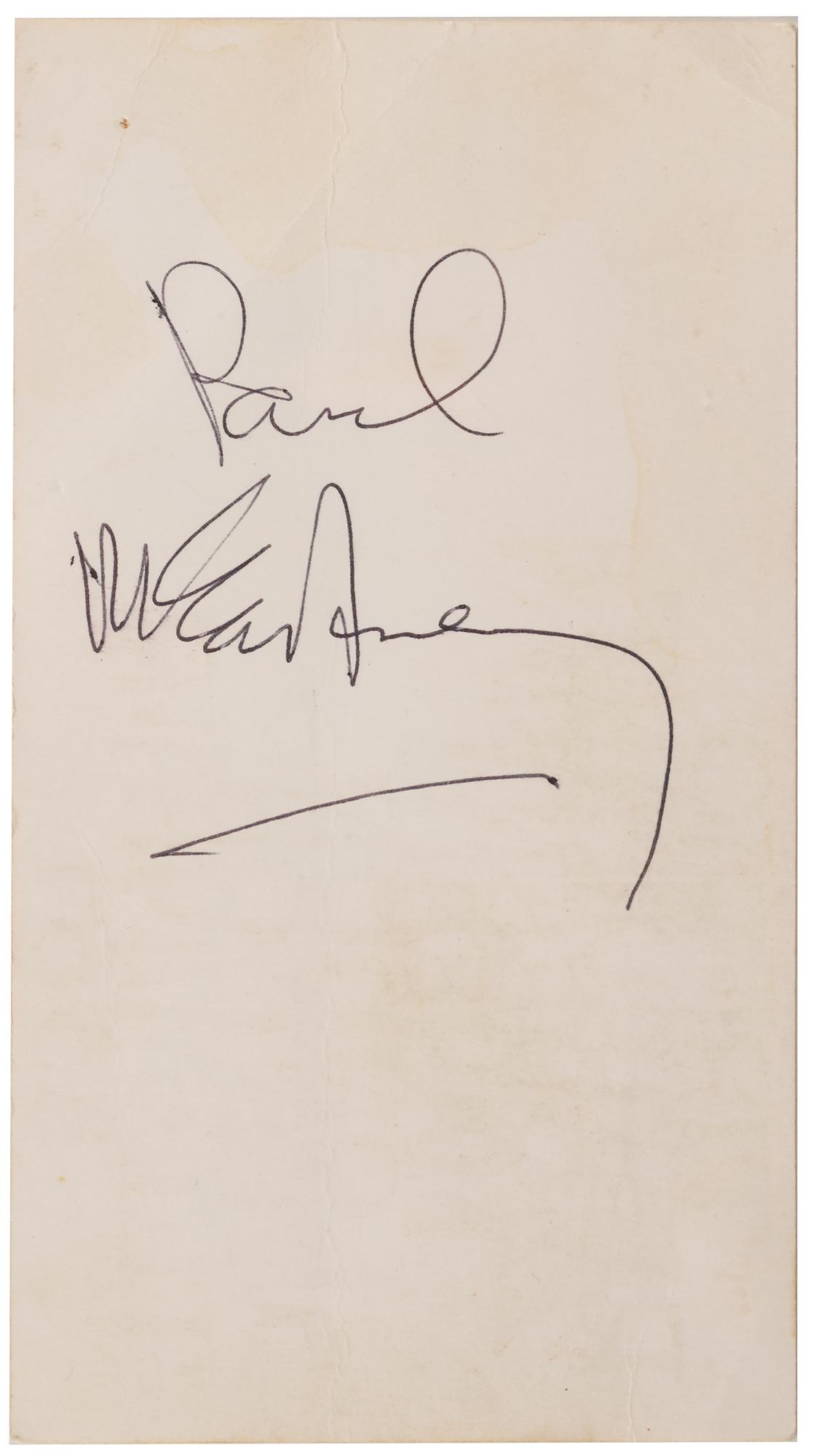 Vintage ballpoint signature, "Paul McCartney,” on the reverse of a 3 x 5.5 business card for the Tiberio Restaurant in Mayfair, London. The consignor notes that the signature was obtained by an employee at the restaurant circa 1965. In fine condition, with some light creases and faint stains. Accompanied by a certificate of authenticity from Tracks.