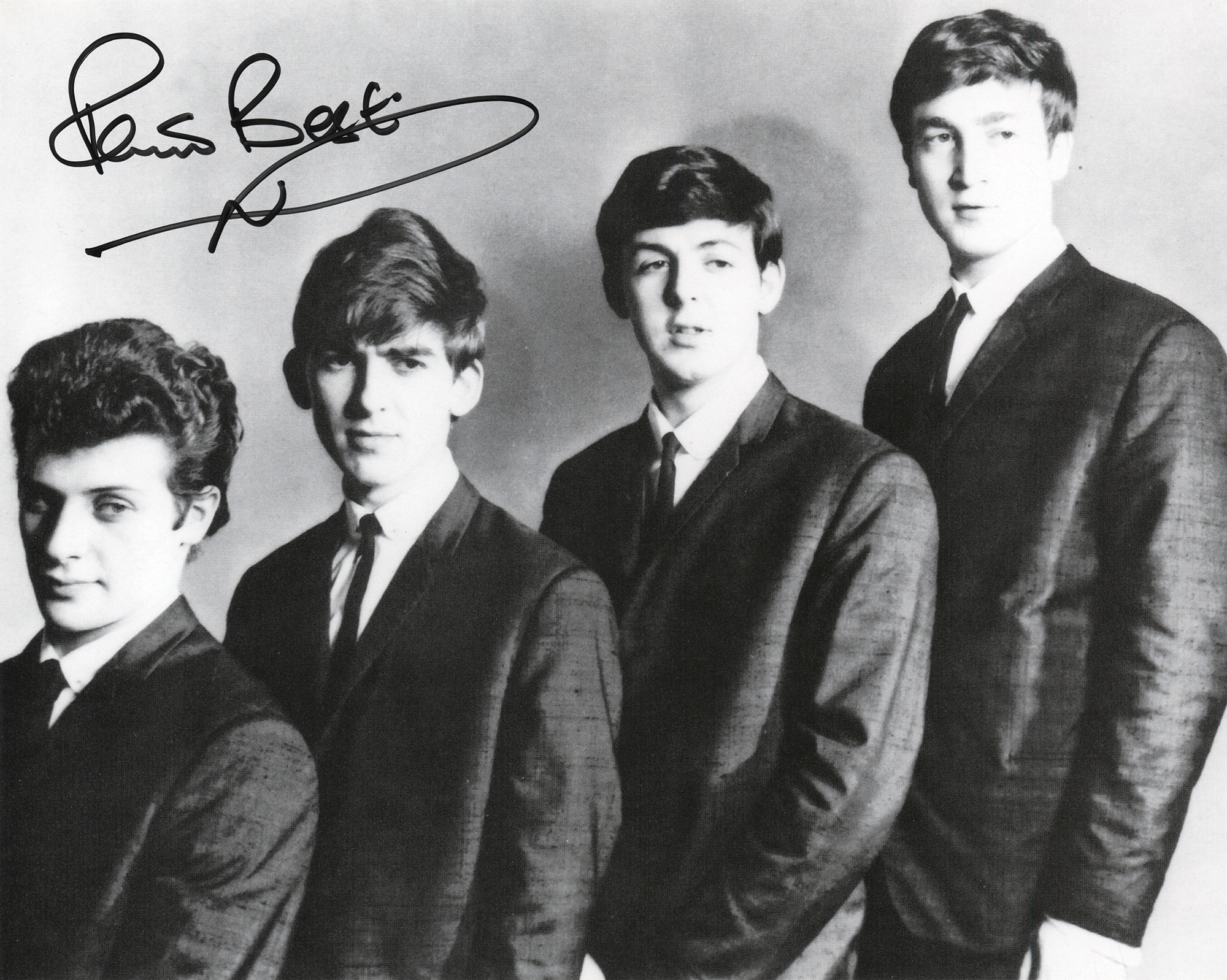 Cardstock 10 x 8 photo of the early Beatles with Pete Best as drummer, signed in black felt tip by Best. In fine condition.