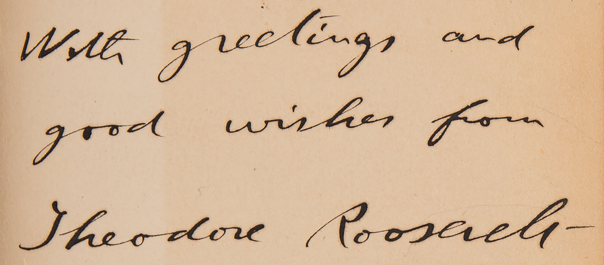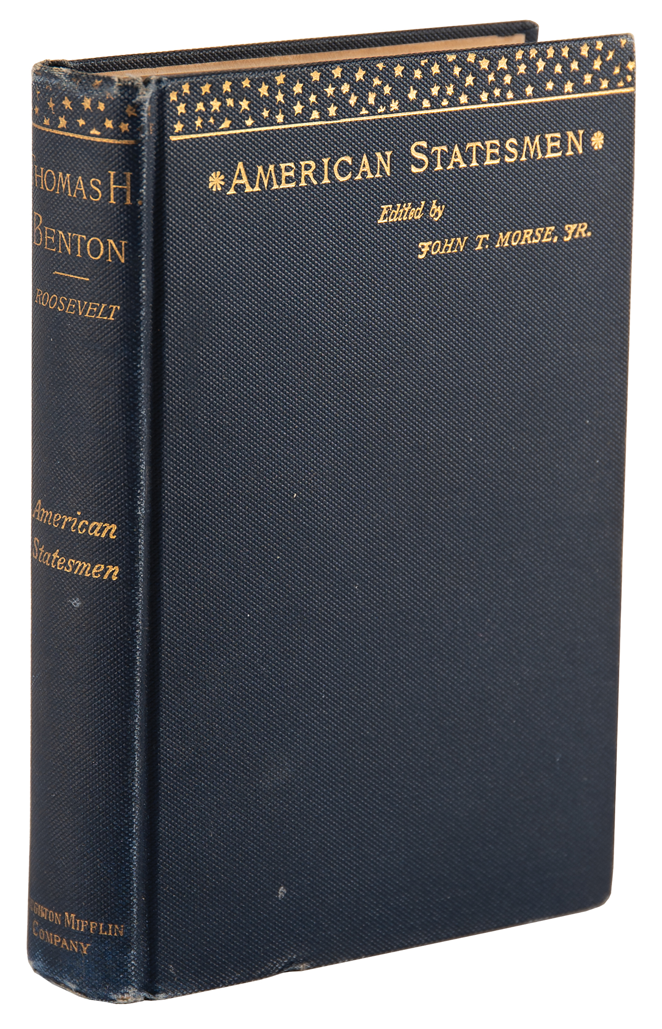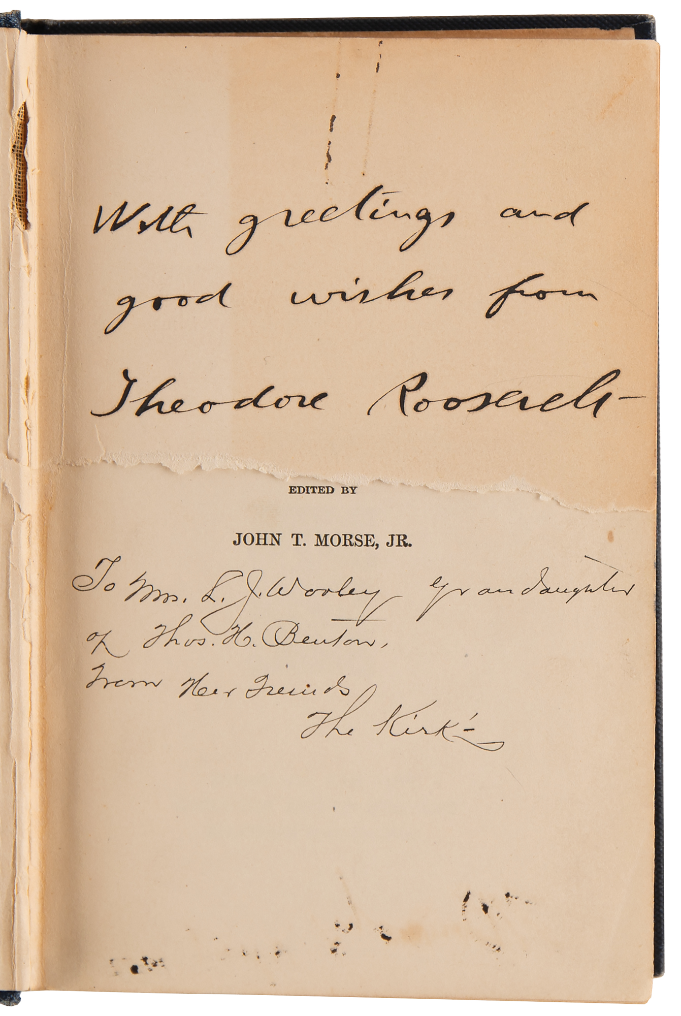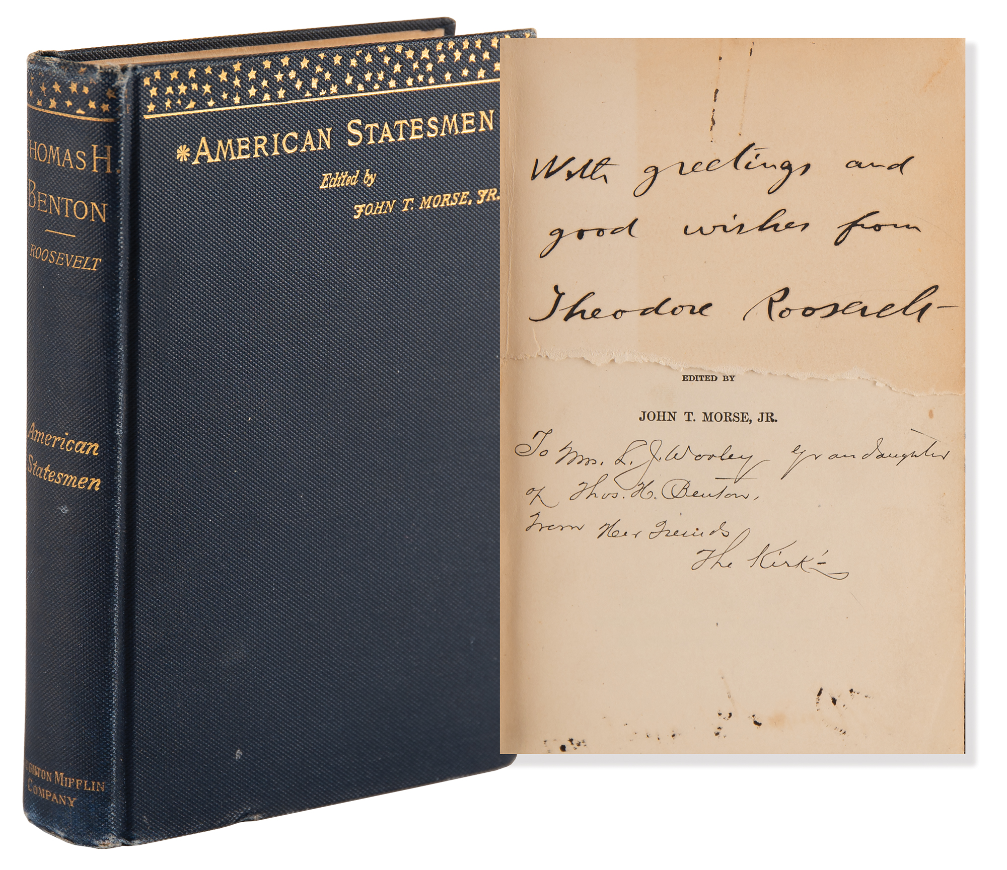 Signed book: American Statesmen: Thomas Hart Benton by Theodore Roosevelt. Later printing. Boston: Houghton Mifflin, 1886. Hardcover, 5 x 7, 372 pages. Signed on the torn first free end page in bold ink, "With greetings and good wishes from Theodore Roosevelt." Inscribed in another hand on the half-title page, "To Mrs. L. J. Worley, grandaughter of Thos. H. Benton, from Her Friends, The Kirk's," with another inscription to the front pastedown. Autographic condition: very good to fine, with toning and a rusty paperclip impression to the torn signed page. Book condition: VG-/None, with wear to spine ends, paper cracked at hinges, and aforementioned loss to the first free end page.