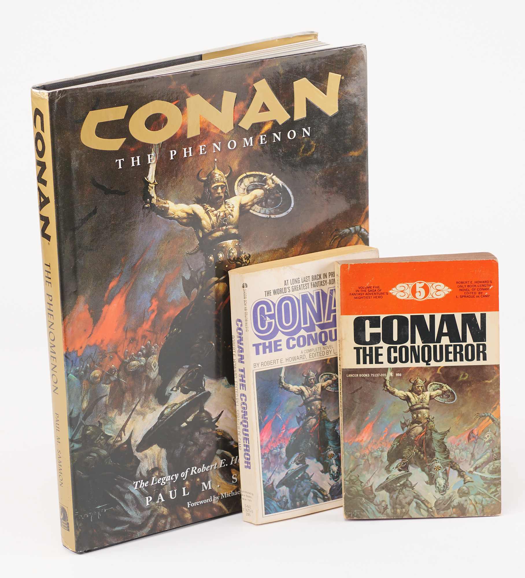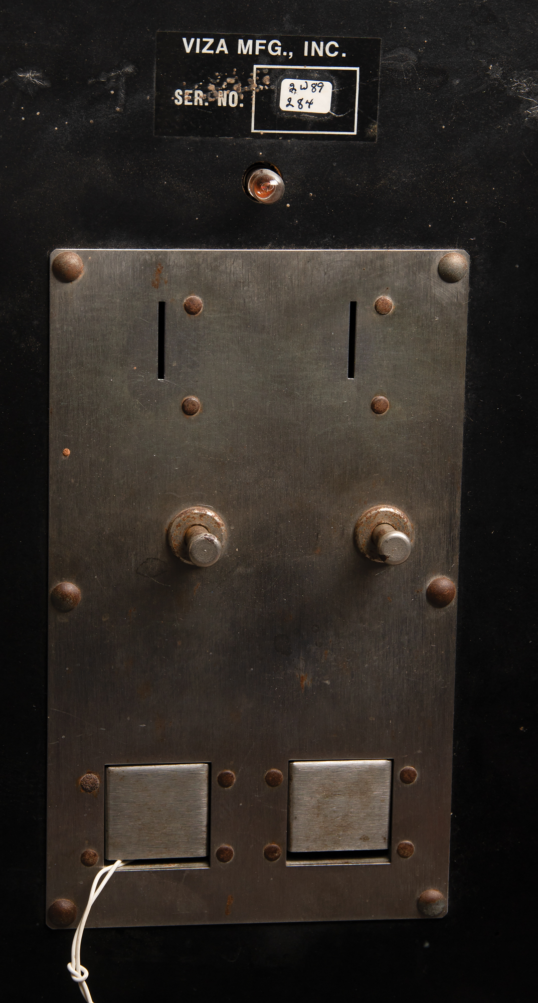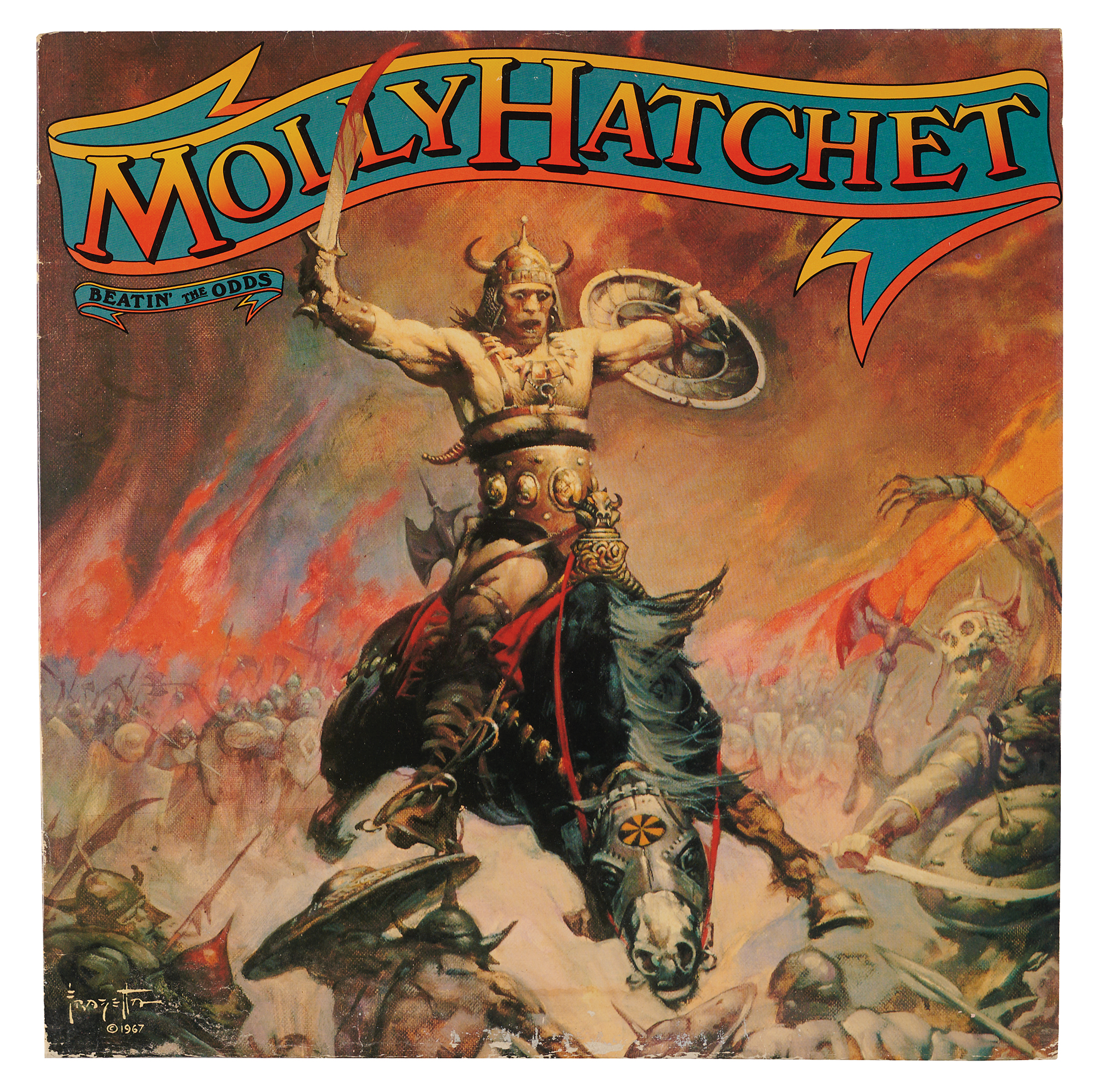 Uncommon original WAR ‘solid state electronic’ two-player head-to-head pinball machine manufactured by Viza Mfg., and originally released in 1978 with a small production run of 100-200 units. The cocktail table machine measures 32? x 42? x 28? and functions as a rare head-to-head pinball machine, where two players at opposite ends of the playfield compete in simultaneous play. The game can also be played as a single player. Of particular interest is the playfield’s dramatic artwork graphics, which feature two close-up images of legendary artist Frank Frazetta’s iconic 1967 oil painting, ‘The Berserker,’ a wide-eyed barbarian with outstretched arms and a horned helmet. The playfield includes eight flippers, pop bumpers, and slingshots, and both player sides feature flipper buttons, game instructions, and a scoreboard. WAR is also known for being one of the first, if not the first, examples of LED digit segment displays being used instead of high-voltage glass segment displays. In fine condition, with scattered scuffs and marks to the cabinet. Accompanied by an ephemera group lot of items featuring Frazetta’s ‘The Berserker’ on its cover. With its rare head-to-head cocktail design, striking Frank Frazetta artwork, and incredibly low production run, WAR stands out as one of the more distinctive and collectible pinball machines of its era.