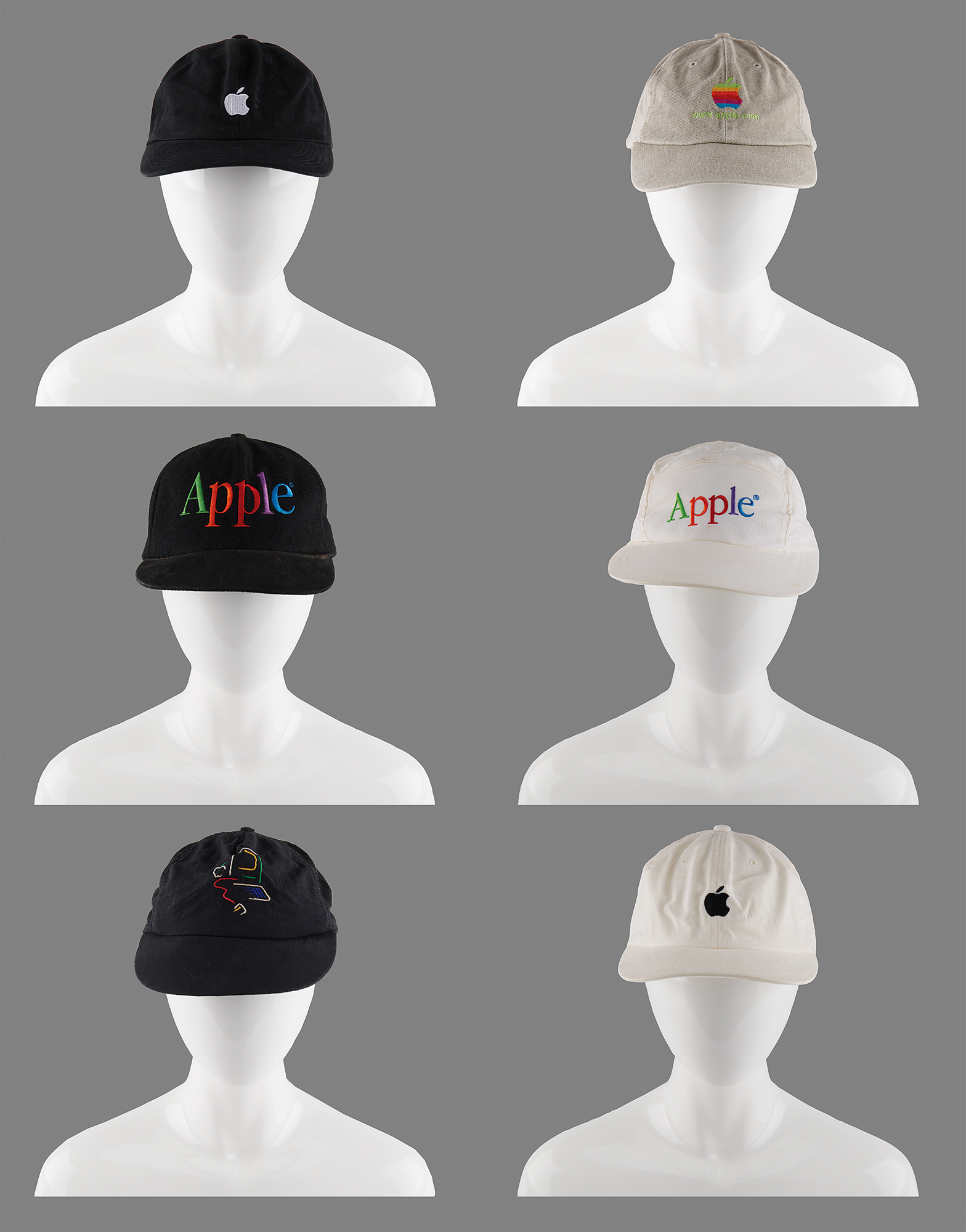 Group lot of six Apple Computer caps, including two snapback versions and four strapback versions, all featuring an Apple logo to the crown, one of which includes a Macintosh-era 'Picasso' logo. In overall fine condition, with some scattered wear and stains from use.