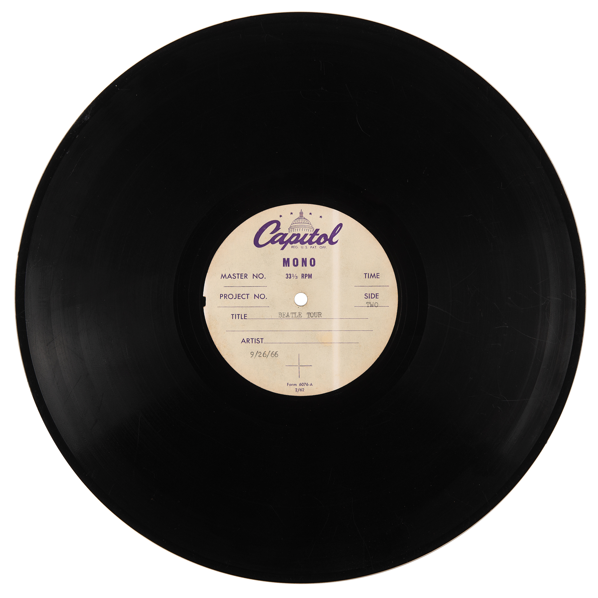 Fantastic 12? US Capitol Records two-sided acetate for the unreleased project entitled Beatle Tour, featuring mono clips from Jerry G.'s interviews with the Beatles during their 1965 North American tour. The acetate disc bears purple-and-white Capitol labels, filled out in type: "Title: Beatle Tour, 9/26/1966."