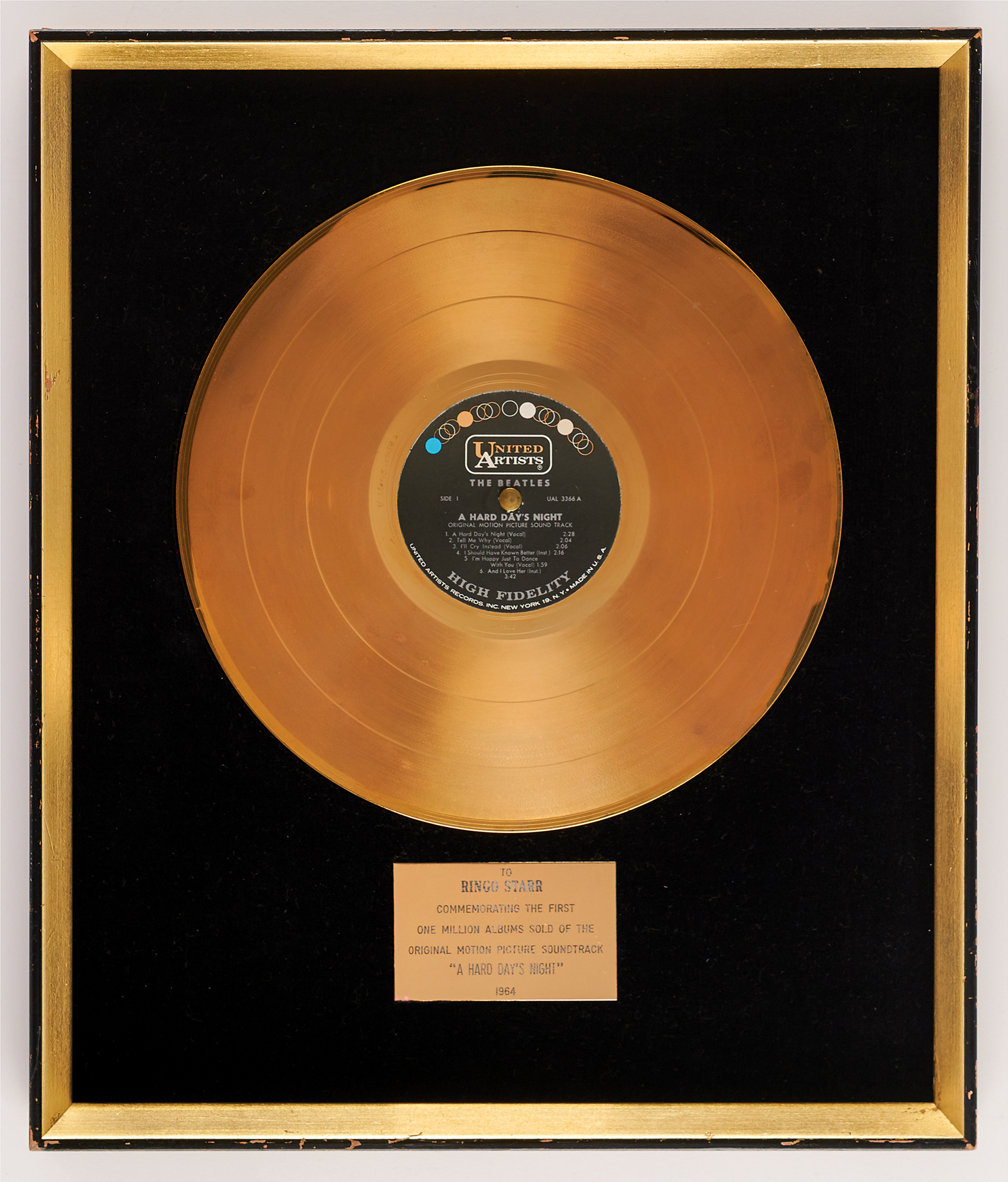 Amazing original United Artists in-house gold record award, presented to "Ringo Starr, commemorating the first one million albums sold of the original motion picture soundtrack 'A Hard Day's Night,' 1964." Framed with its gold disc and engraved plaque to an overall size of 16.75 x 20. In very good to fine condition, with some light scratches to the frame and the glass recently replaced.