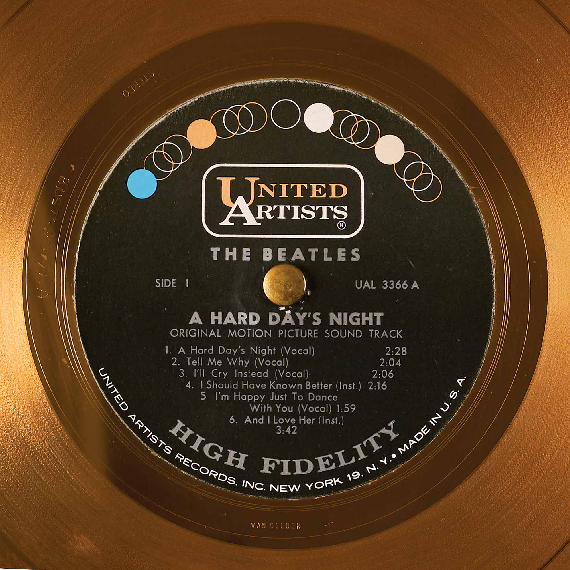 In 1964, United Artists executive David Picker recognized the immense potential of the Beatles and spearheaded the production of their first feature film, A Hard Day’s Night. The film’s corresponding soundtrack album, released in the United States by United Artists on June 26, 1964, became an unprecedented success—selling over 5.3 million copies that year and dominating the Billboard charts for 14 consecutive weeks. Despite this massive achievement, United Artists was not a member of the Recording Industry Association of America (RIAA) at the time and was therefore ineligible to receive official RIAA gold record certification. To honor the Beatles’ accomplishment, United Artists decided to create its own custom in-house gold record awards for the band.