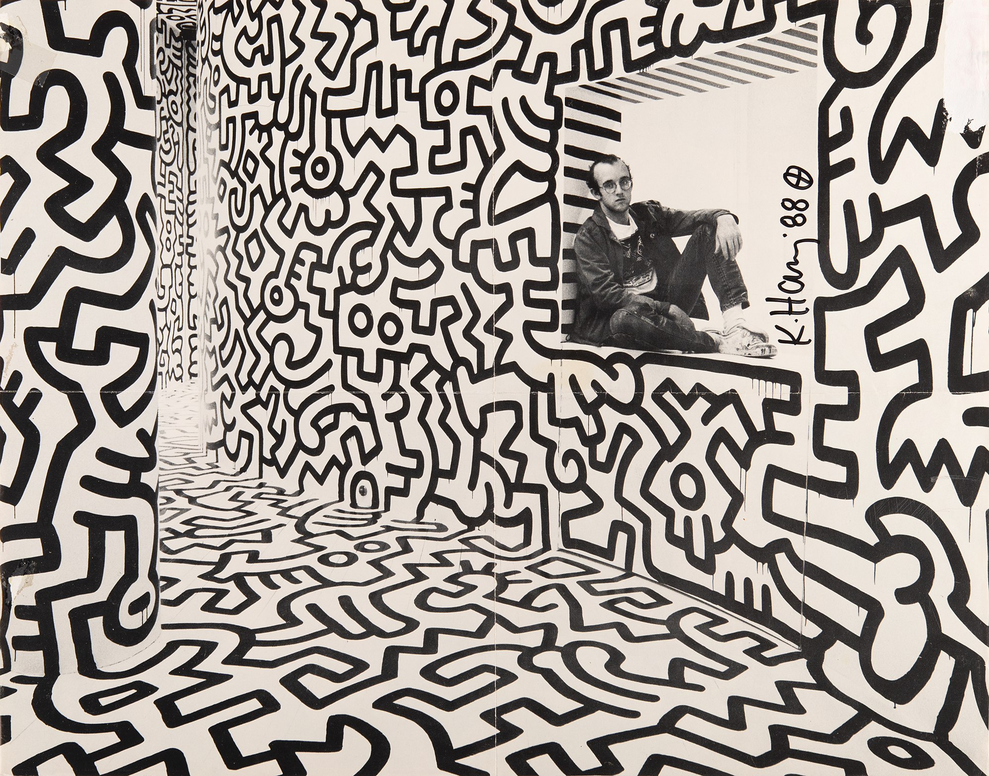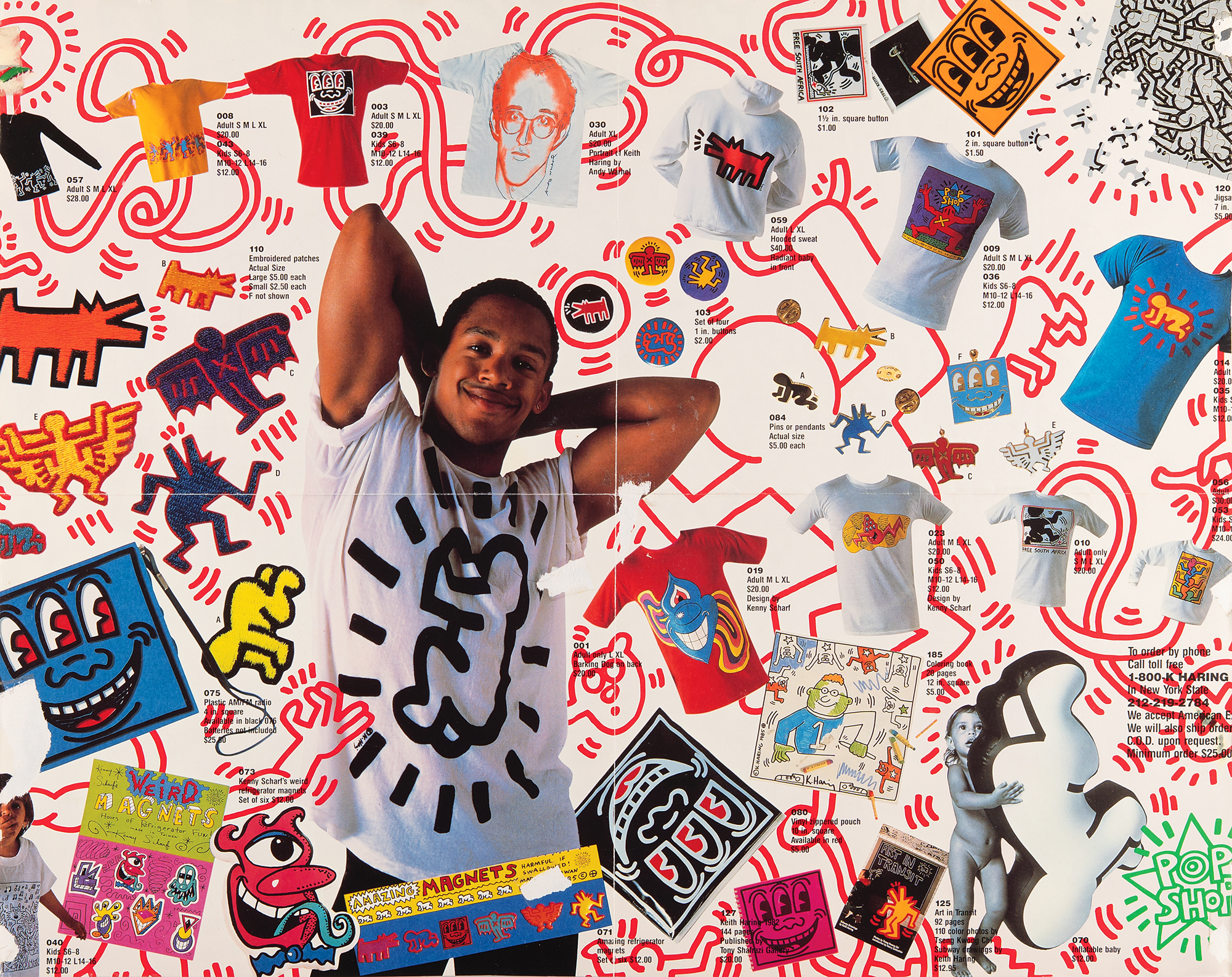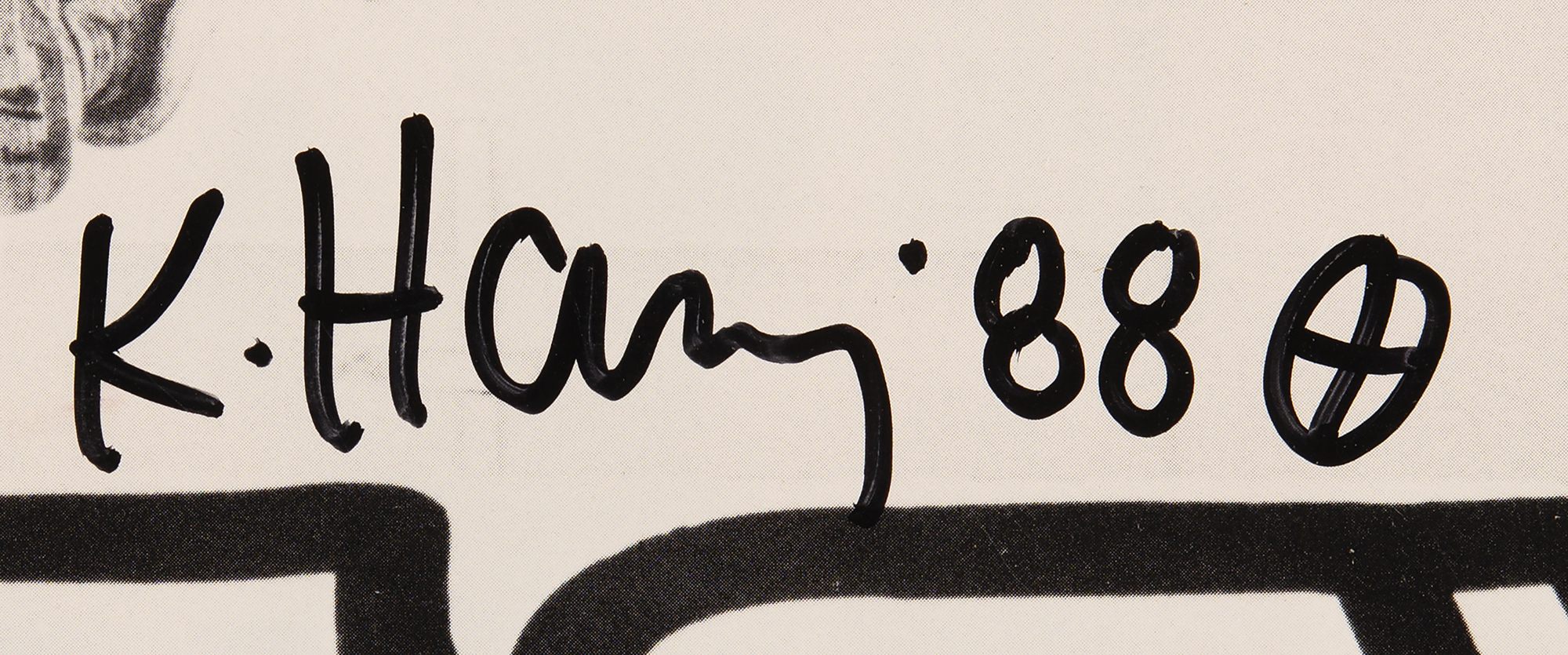 Attractive 20.25 x 15.75 dual-sided poster of Keith Haring seated in a window at his legendary Pop Shop store in Manhattan's SoHo neighborhood, with the walls, floor, and ceiling all painted with Haring's stylized artwork, signed vertically in black felt tip, “K. Haring, 88,” who adds his circle-cross symbol. The reverse features a catalog of items for sale at the store. In fine condition, with a faint stain, and intersecting folds as issued.