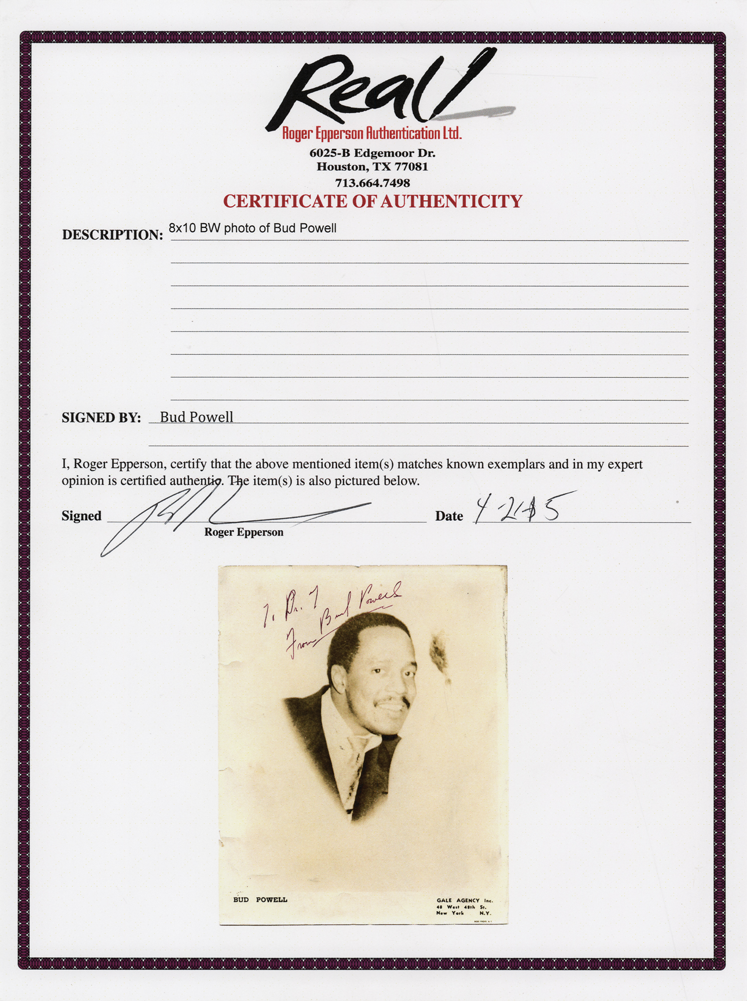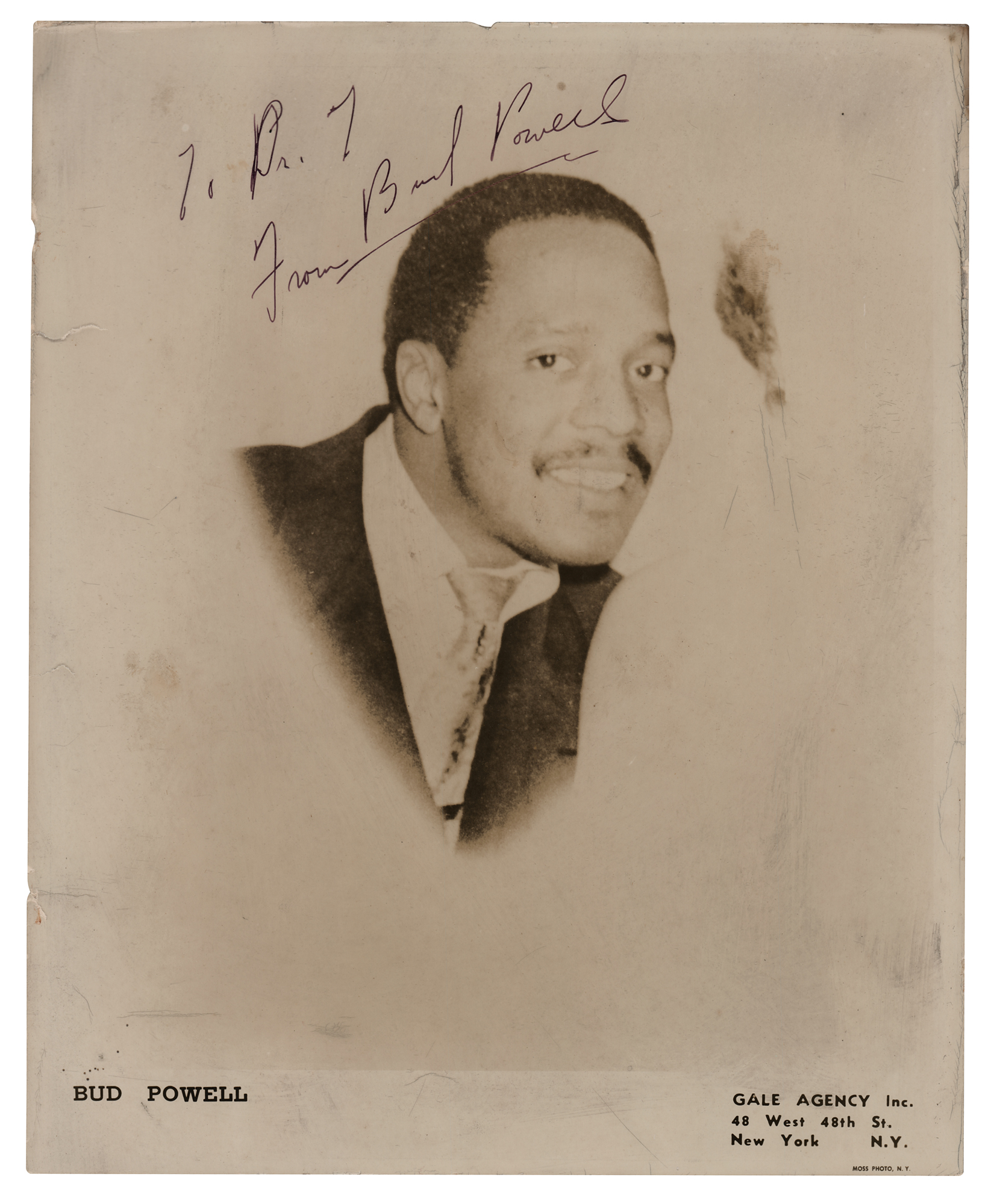 Jazz pianist (1924-1966) influential in the development of bebop. Vintage glossy 8 x 10 Gale Agency publicity photo of the great jazz pianist, signed and inscribed in fountain pen, "To Dr. T, From Bud Powell.” In very good to fine condition, with scattered small creases, and several short tears to the left edge. Accompanied by a full letter of authenticity from REAL and a provenance statement, explaining that the photograph comes from the collection of Dr. Reuben Troxell, a jazz enthusiast who displayed his autograph collection on the walls of his practice.