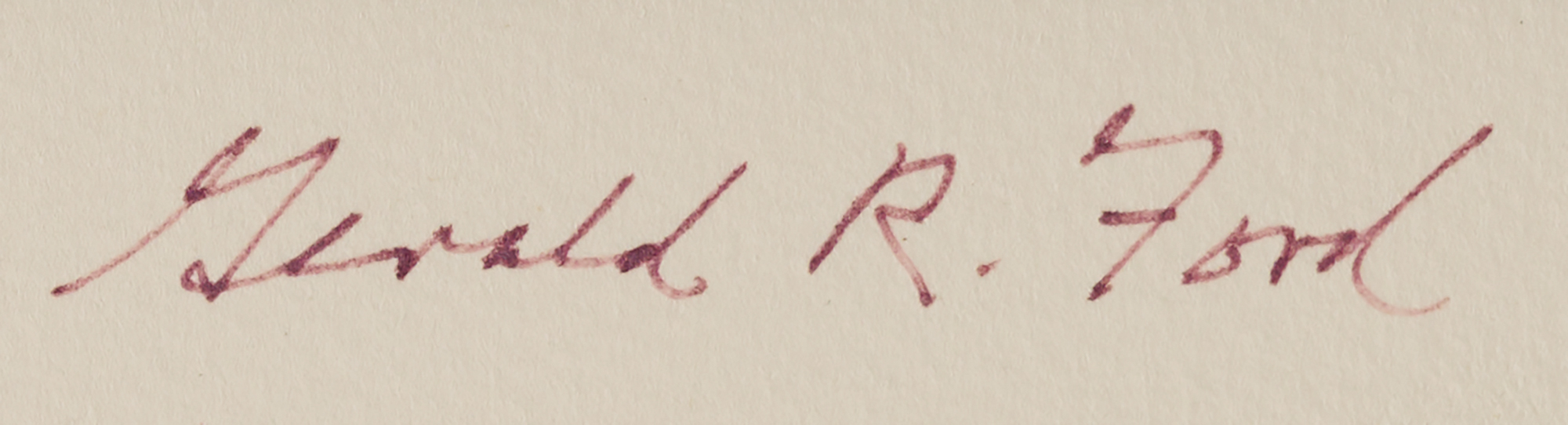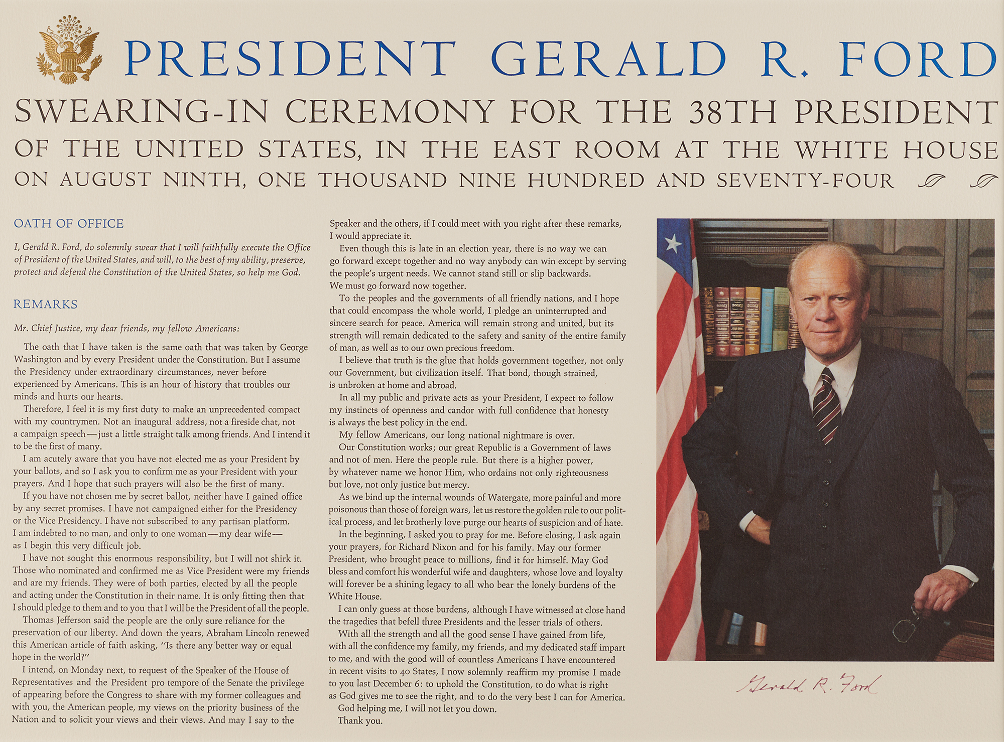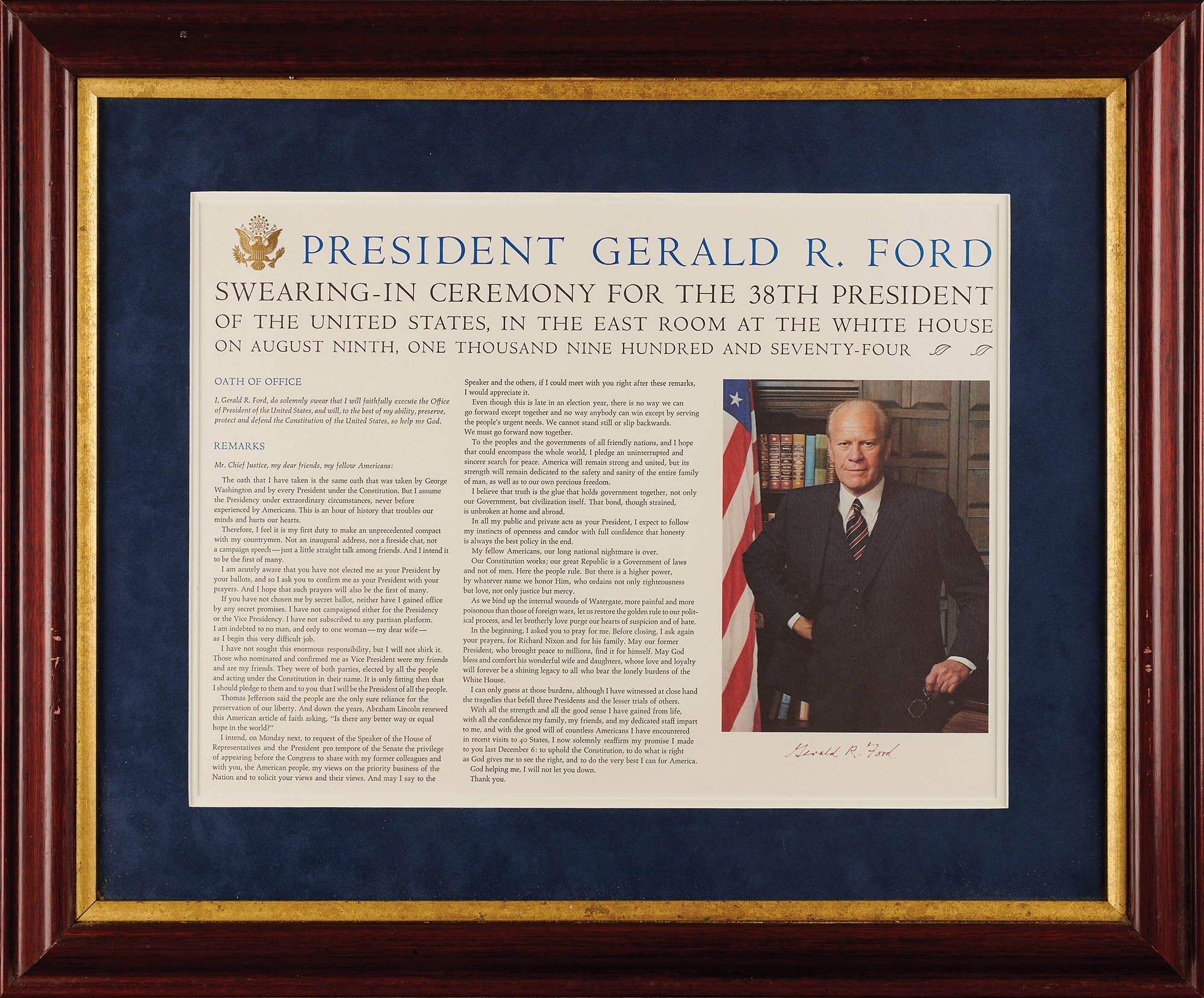 Color 18 x 13 print featuring Ford's portrait, oath of office, and speech delivered on August 9, 1974, signed in felt tip, "Gerald R. Ford." Double-matted and framed to an overall size of 27 x 22.5. In very fine condition.