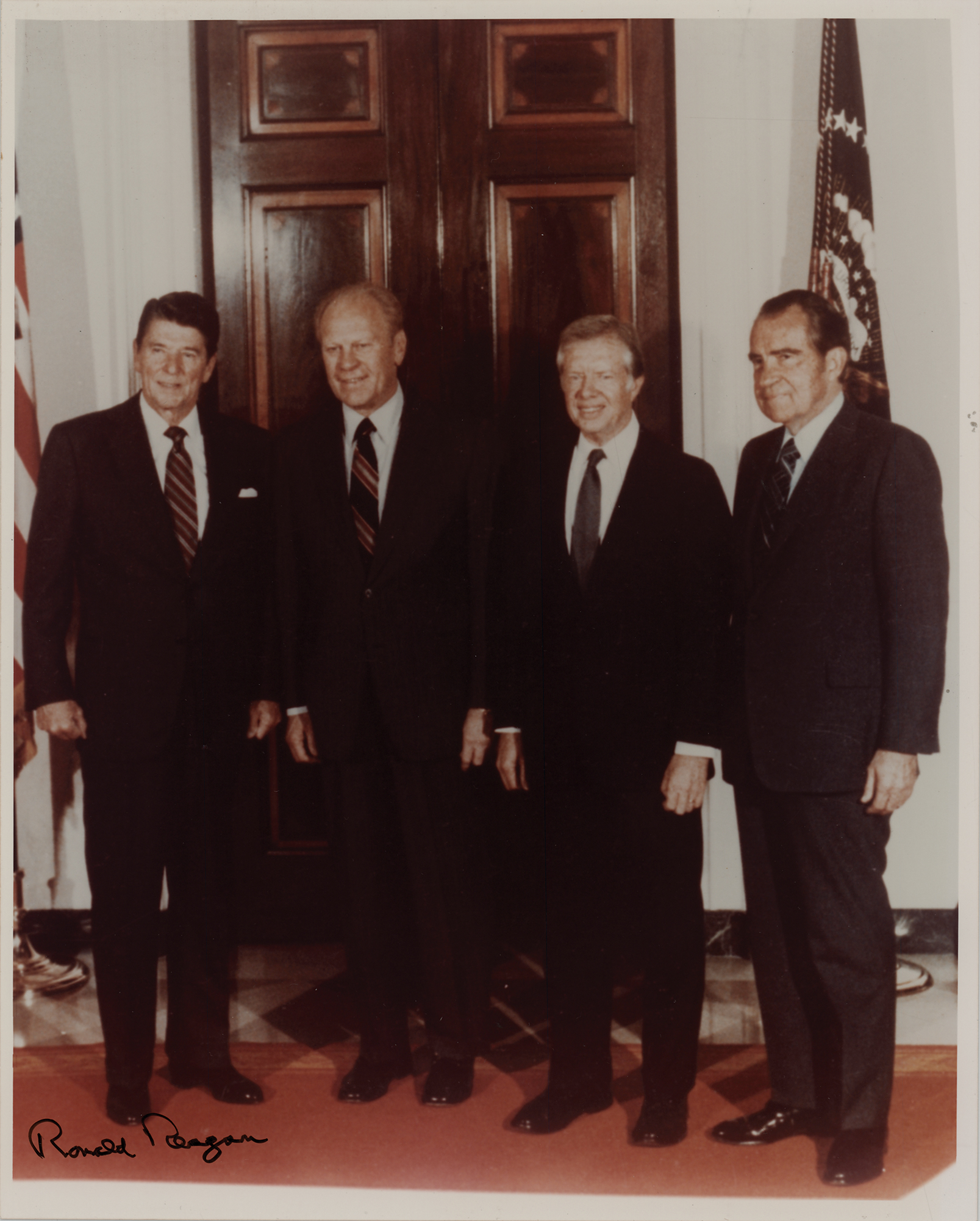 Color glossy 8 x 10 photo of Presidents Nixon through Reagan gathered at the White House before departing for Anwar Sadat's funeral in 1981, signed in black felt tip by Ronald Reagan. In fine condition.