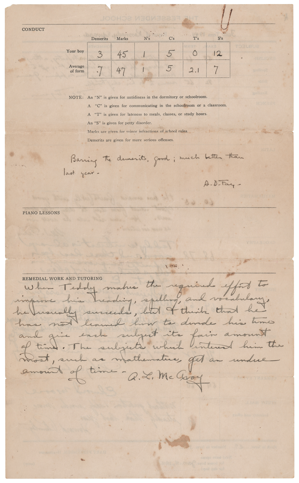 Report card for 12-year-old Ted Kennedy as a seventh-grade student at The Fessenden School in West Newton, Massachusetts, one page both sides, 8.5 x 14, issued for the Fall term of 1944. Kennedy’s exam and term grades are average-to-below-average across all subjects, with Kennedy receiving his highest marks in Science (“76” and “72”) and his lowest in English (“58” and “61”). His class rank in form is 27 of 43, which, per his conduct statement, is “much better than last year.” The concluding remark on Kennedy’s “Remedial Work and Tutoring” reads: “When Teddy makes the required effort to improve his reading, spelling, and vocabulary, he usually succeeds, but I think that he has not learned how to divide his time and give each subject its fair amount of time. The subjects which interest him the most, such as mathematics, get an undue amount of time.” In very good to fine condition, with scattered staining.