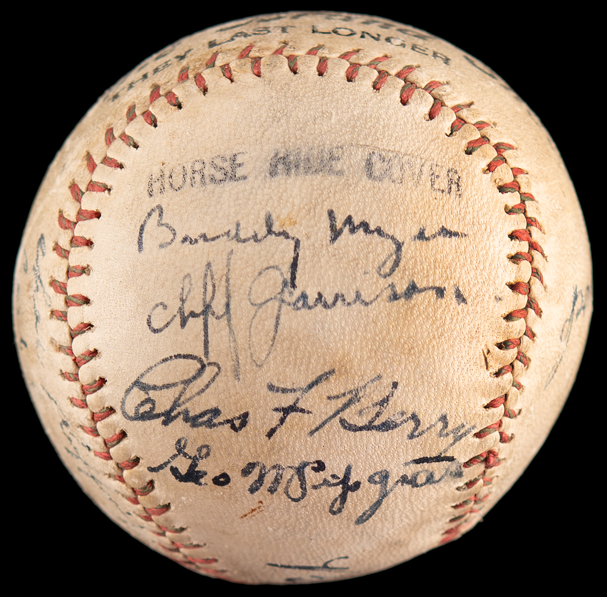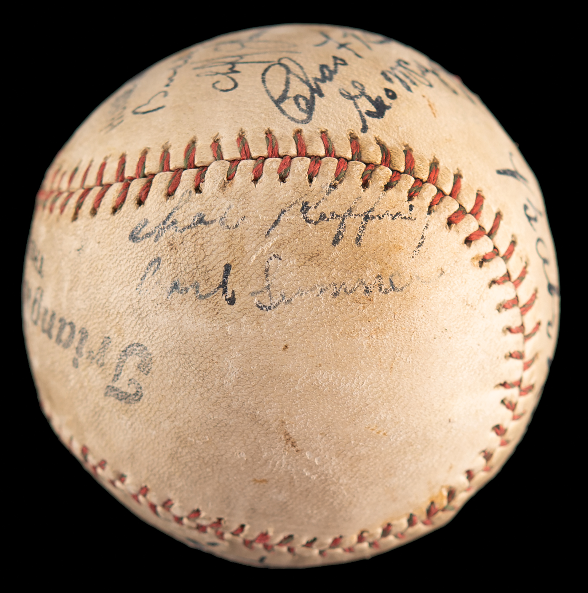 Circa 1928 baseball signed on the sweet spot in black ink, “Babe Ruth,” and on a side panel, “Lou Gehrig.” The ball is also signed by several period players from the New York Yankees (George Pipgras, Benny Bengough, and Hall of Famer Herb Pennock) and the Boston Red Sox (Cliff Garrison, Charlie Berry, Buddy Myer, Carl Sumner, and Hall of Famer Red Ruffing). In very good to fine condition, with mild scuffing and light soiling. An exceptional Ruth-Gehrig signed ball—one of the most coveted combos in sporting history—further enhanced by its late 1920s era. By the close of the 1928 season, the Yankees had firmly established themselves as baseball’s preeminent dynasty, capturing their second consecutive World Series championship and further cementing the legendary partnership of Ruth and Gehrig at the peak of their powers.