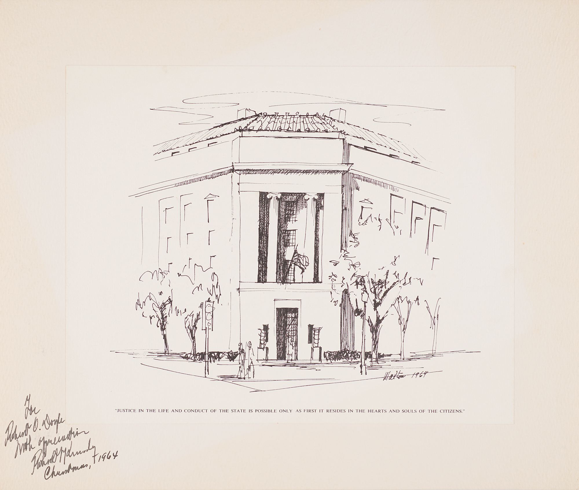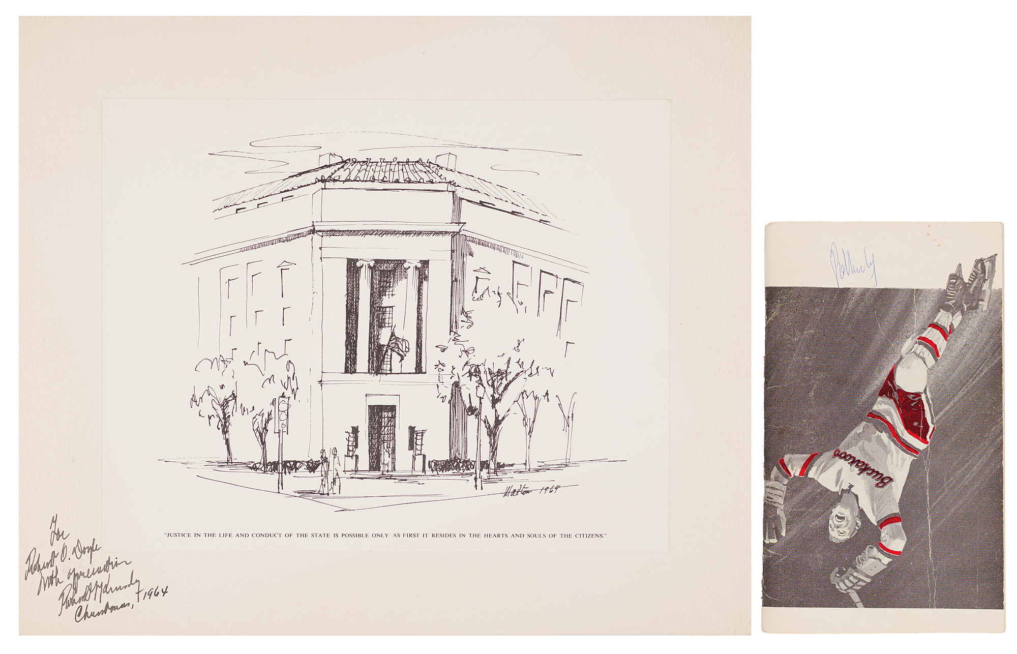 Two items: vintage 13 x 11 print of a political sketch featuring a quote from Plato, signed and inscribed on the mount in black ink as senator-elect, “For Robert O. Doyle, with appreciation, Robert F. Kennedy, Christmas, 1964”; and a 1968-1969 ‘Be Our Guest’ tourism booklet for the city of Portland, Oregon, 4 x 7, signed on the back cover in blue ballpoint, “R. Kennedy.” In overall very good to fine condition, with a vertical crease to the booklet, not affecting the signature. Accompanied by a signed letter of provenance for the booklet signature.