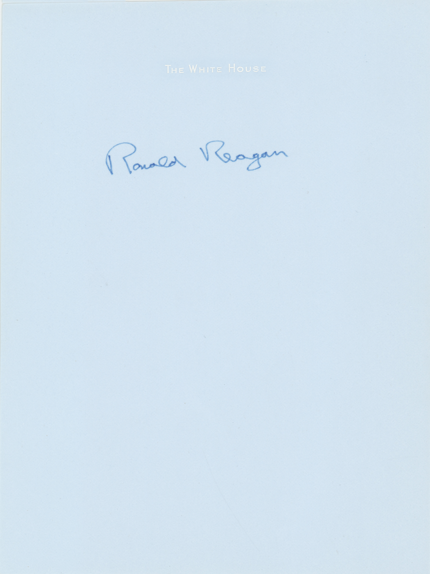 Blue ink signature, "Ronald Reagan,” on a light blue 5.75 x 7.75 sheet of 'The White House' stationery. In very fine condition.