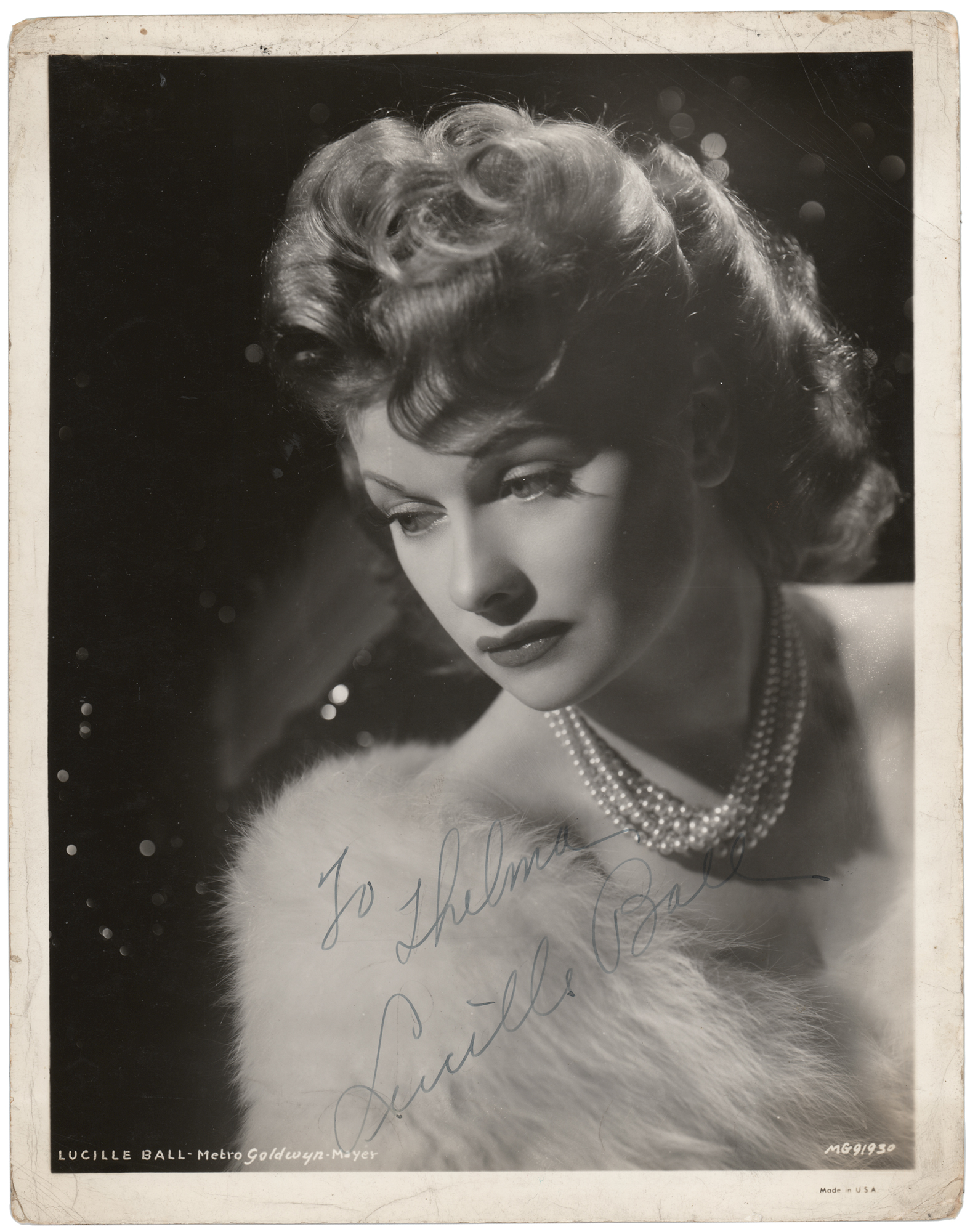 Vintage glossy 8 x 10 Metro-Goldwyn-Mayer publicity photo of the actress and comedian wearing strings of pearls, signed and inscribed in fountain pen, "To Thelma, Lucille Ball.” In very good condition, with scattered creasing, heaviest to the upper right corner area.