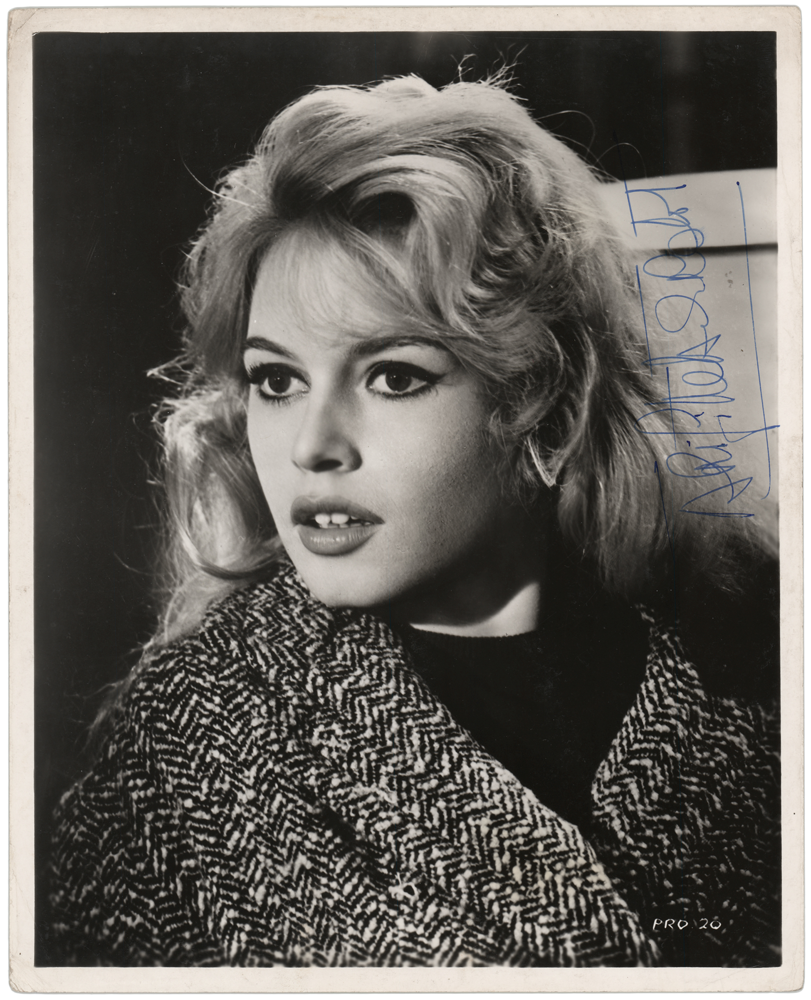 Vintage glossy 8 x 10 head-and-shoulders photo of Brigitte Bardot, signed vertically in fountain pen. In fine condition.