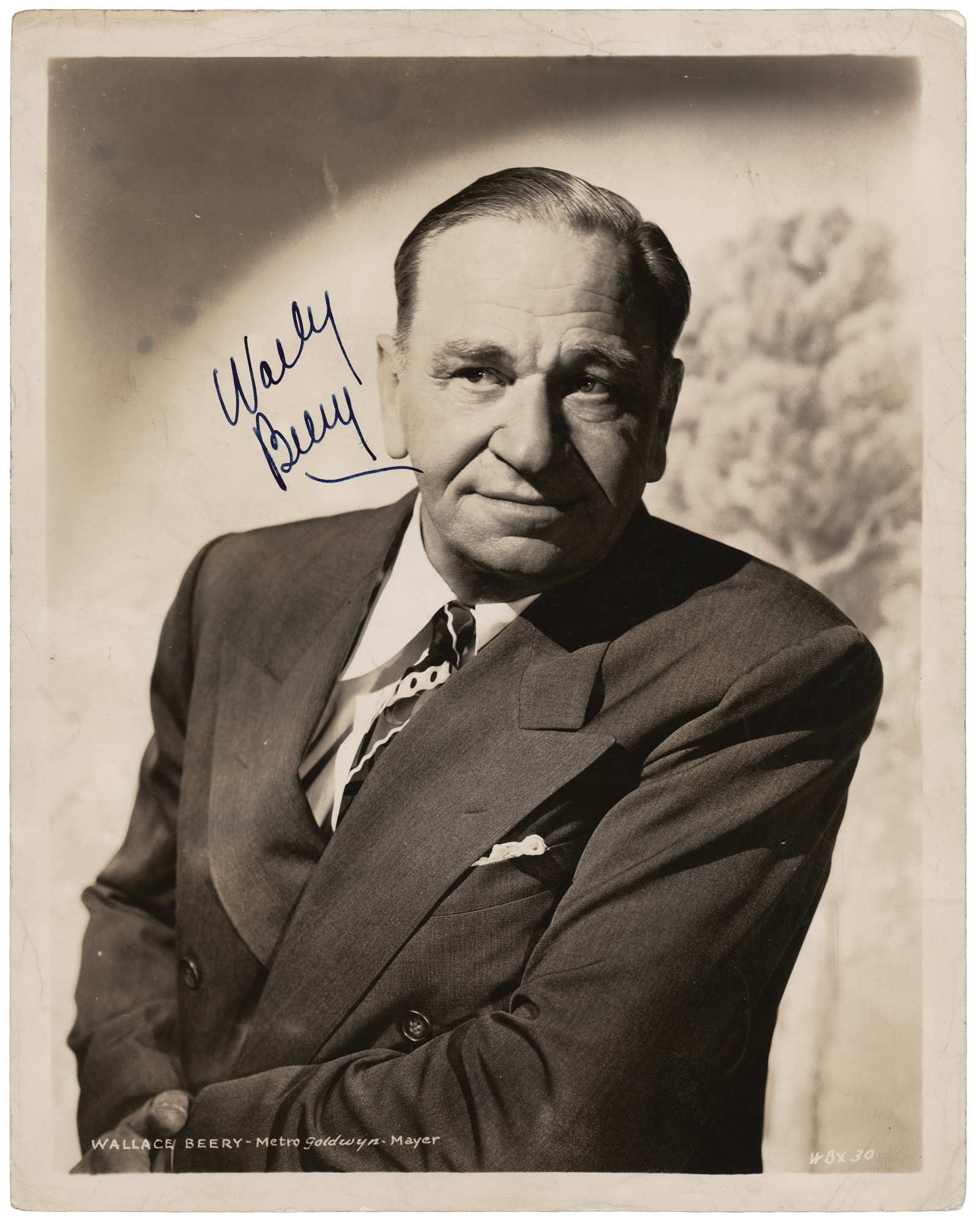 Vintage glossy 8 x 10 Metro-Goldwyn-Mayer publicity photo of Wallace Beery in a suit and tie, signed in fountain pen, "Wally Beery." In very good to fine condition, with overall creasing.