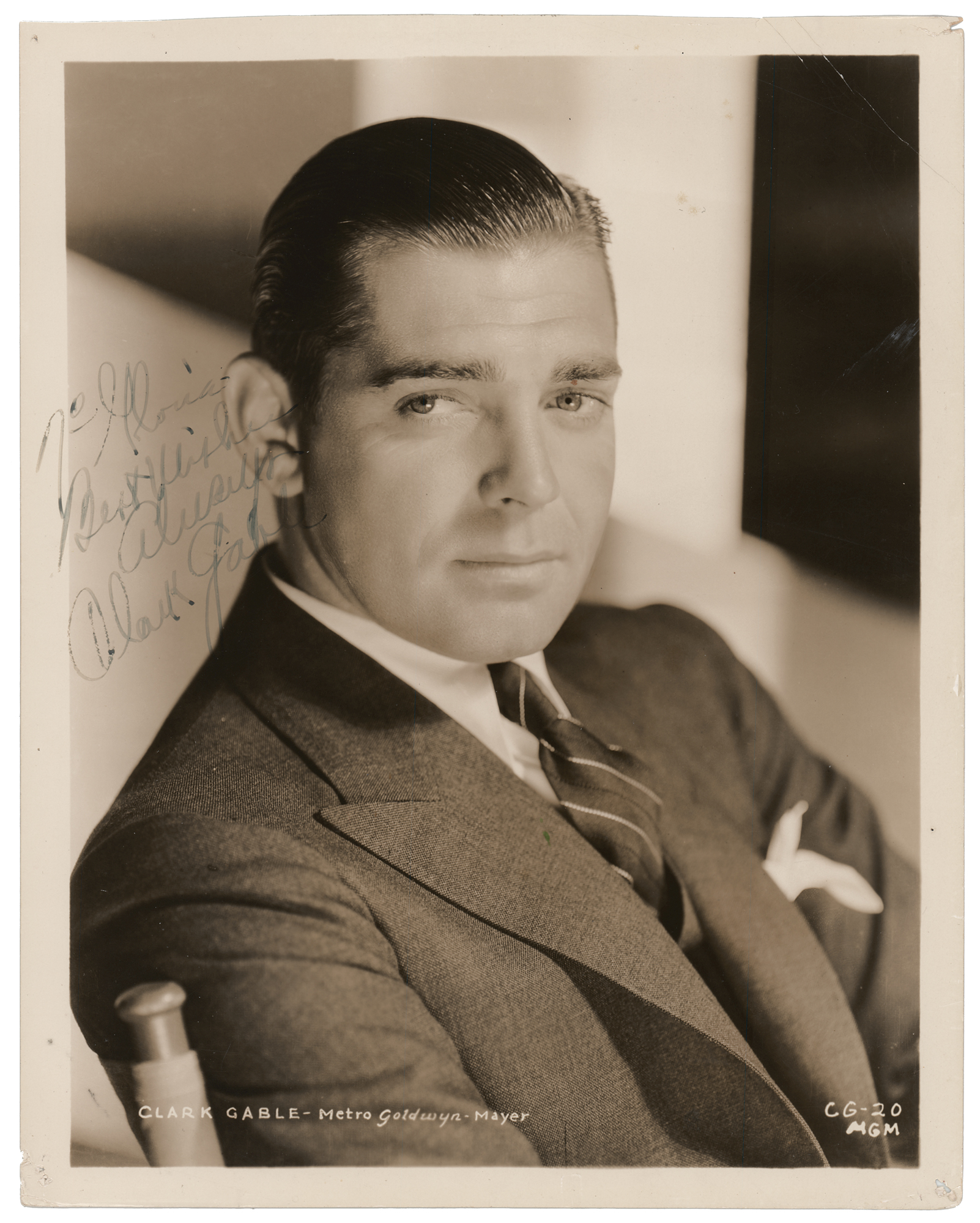 Early vintage glossy 8 x 10 Metro-Goldwyn-Mayer publicity photo of the matinee idol in a debonair head-and-shoulders pose, signed and inscribed in fountain pen, "To Gloria, Best Wishes Always, Clark Gable.” In fine condition, with tack holes to the corners.