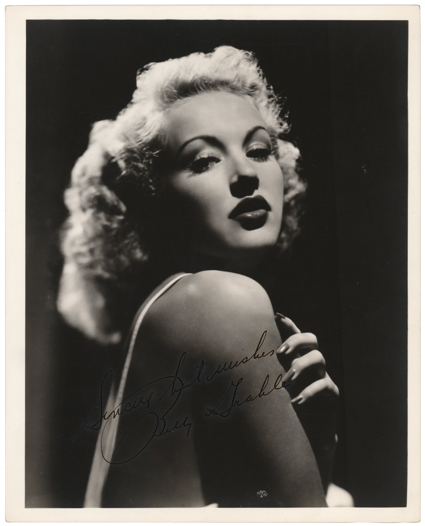 Vintage matte-finish 8 x 10 photo of the pinup icon glancing over her shoulder, signed in fountain pen, "Sincere best wishes, Betty Grable." In fine condition, with eerie haloing to the ink.