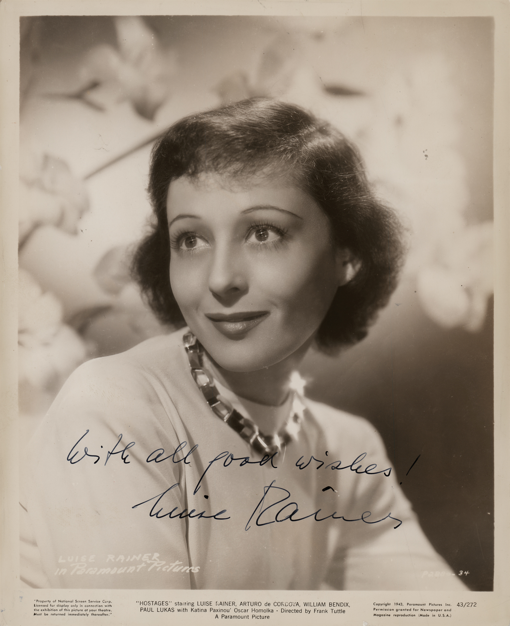 Vintage glossy 8 x 10 Paramount Pictures promotional photo of Rainer as Milada Pressinger in the 1943 war film Hostages, signed in fountain pen, "With all good wishes! Luise Rainer." In fine condition.