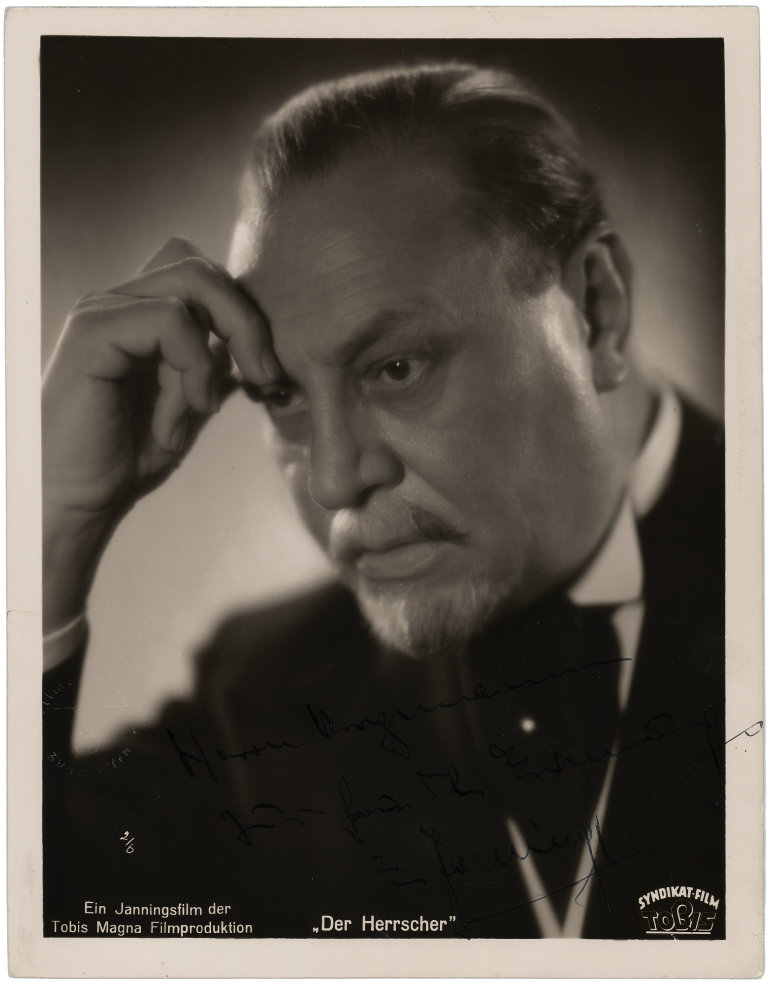 German-Austrian actor (1884–1950) who became the first winner of the Academy Award for Best Actor; he is best known for his collaborations with F. W. Murnau and Josef von Sternberg. Vintage glossy 9 x 11.75 photo of Emil Jannings in his 1937 role as Matthias Clausen in Der Herrscher, signed and inscribed in fountain pen in German. In fine condition.