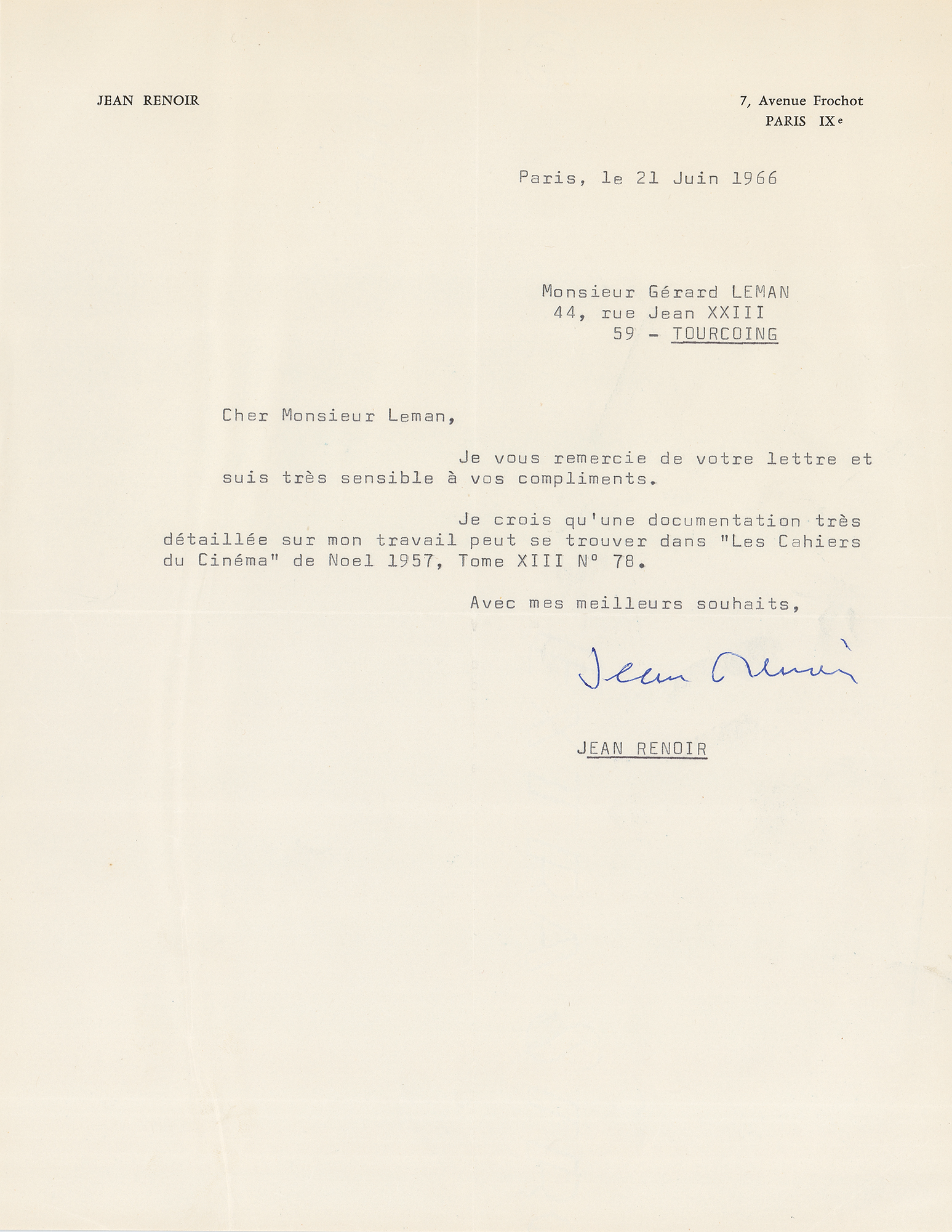 Distinguished French director (1894-1979) whose 1939 classic Rules of the Game takes a place among the most acclaimed films ever made. TLS in French, one page, 8.25 x 10.5, personal letterhead, June 21, 1966. Letter to Gerard Leman, in full (translated): "Thank you for your letter and am very appreciative of your compliments. I believe that a very detailed documentation on my work can be found in 'Les Cahiers du Cinema' of Noel 1957, Tome XIII No. 78." In fine condition, with light creasing to the left side.