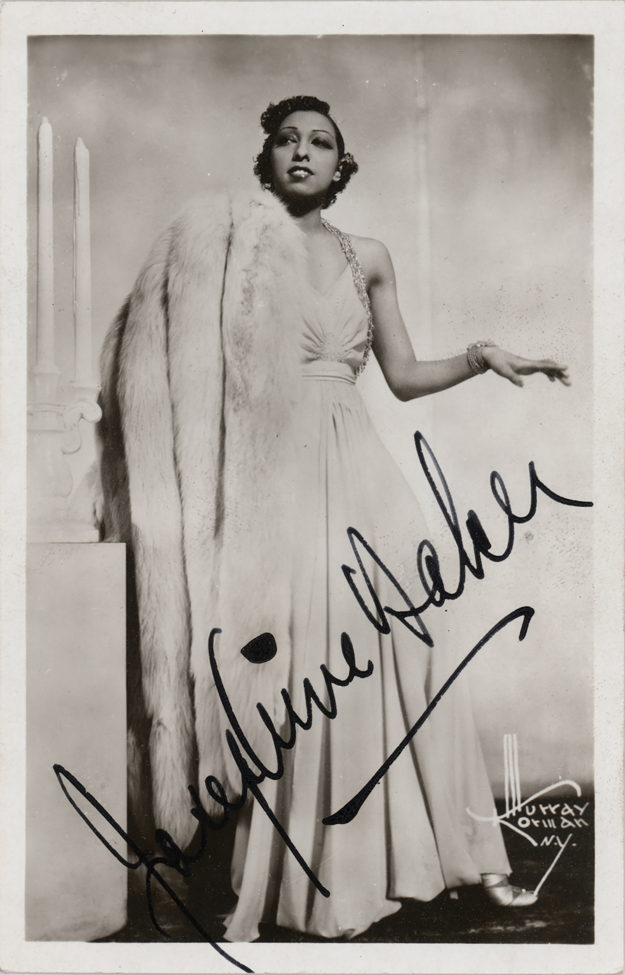 Elegant vintage glossy 3.5 x 5.5 postcard photo of Josephine Baker in a full-length pose by photographer Murray Korman, boldly signed in fountain pen. In fine condition.