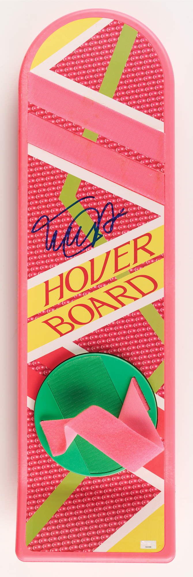 Replica 'Back to the Future Part II' hover board, measuring approximately 28˝ x 8˝, signed on the top in blue felt tip by Michael J. Fox. In fine condition, with a few minor surface dings and scuffs. Accompanied by the worn original box.