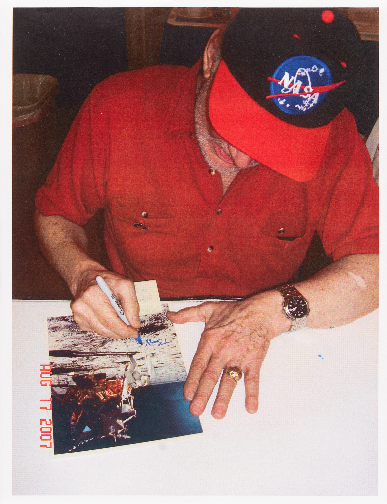 Color semi-glossy 8 x 10 photo of LMP Aldrin adjusting the Solar Wind Composition Experiment and standing in front of the Lunar Module Eagle during the Apollo 11 mission, signed in blue felt tip, “Buzz Aldrin, Apollo XI.” In fine condition. Accompanied by a printed photo taken at the time of the Aldrin signing.