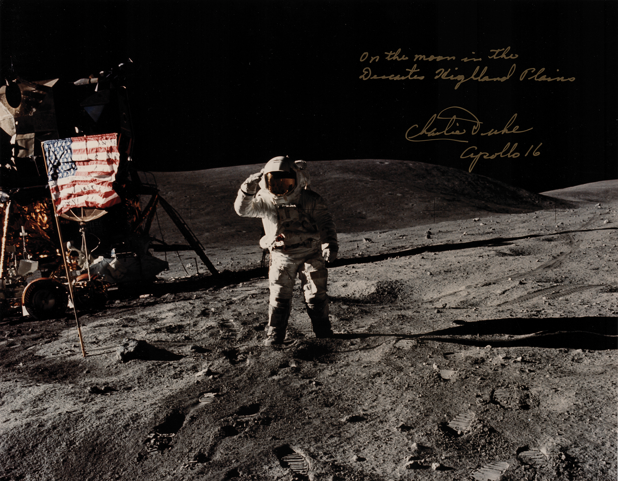 Color semi-glossy 14 x 11 full-length photo of LMP Duke saluting the American flag on the lunar surface during the penultimate Apollo moon-landing mission, signed in gold ink, “On the moon in the Descartes Highland Plains, Charlie Duke, Apollo 16.” In fine condition, with a couple of trivial surface marks, and emulsion irregularity to the left and right edges.