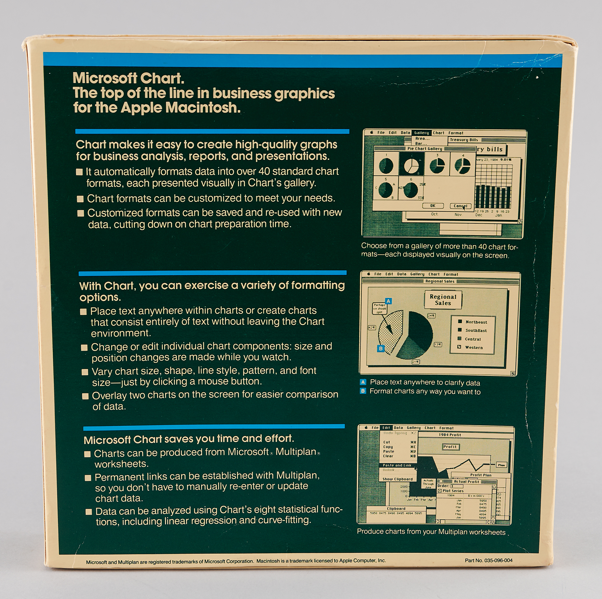Suite of two pieces of Microsoft software developed for the Apple Macintosh—including Microsoft Chart and Microsoft Multiplan—in their original packaging, including floppy disks and user's guides, with Microsoft Multiplan marked as a promotional sample, not for resale. In overall very good to fine condition.
