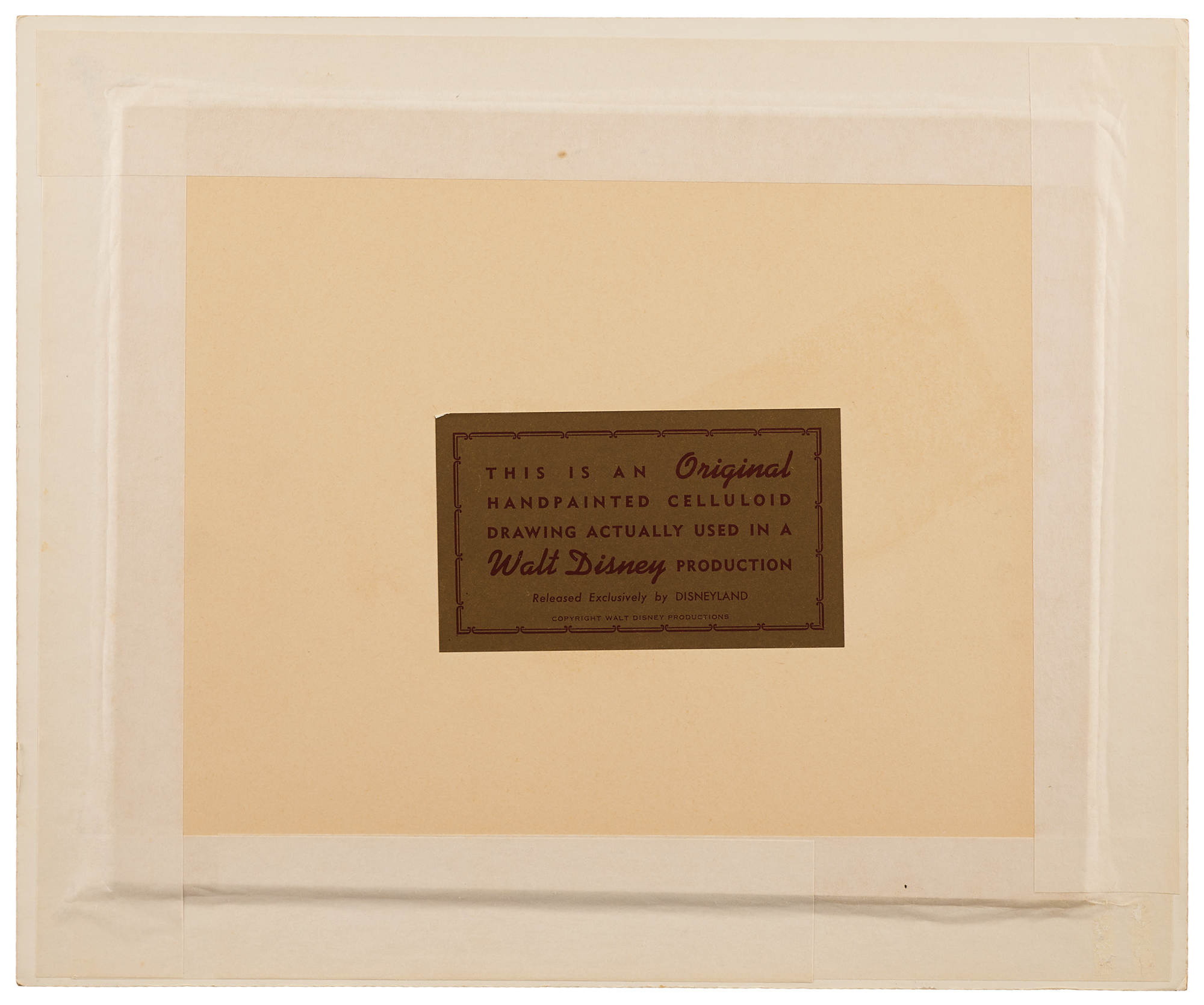 (Walt Disney Studios, 1959) Original production cel of Princess Aurora from Sleeping Beauty, picturing the gorgeous princess in a large half-length pose, with the total character image measuring 6.25 x 5.75. Matted to an overall size of 12 x 10, with the mat reverse bearing a golden Walt Disney Productions label, which reads: "This is an original handpainted celluloid drawing actually used in a Walt Disney production." In fine condition, with light wear to the mat.