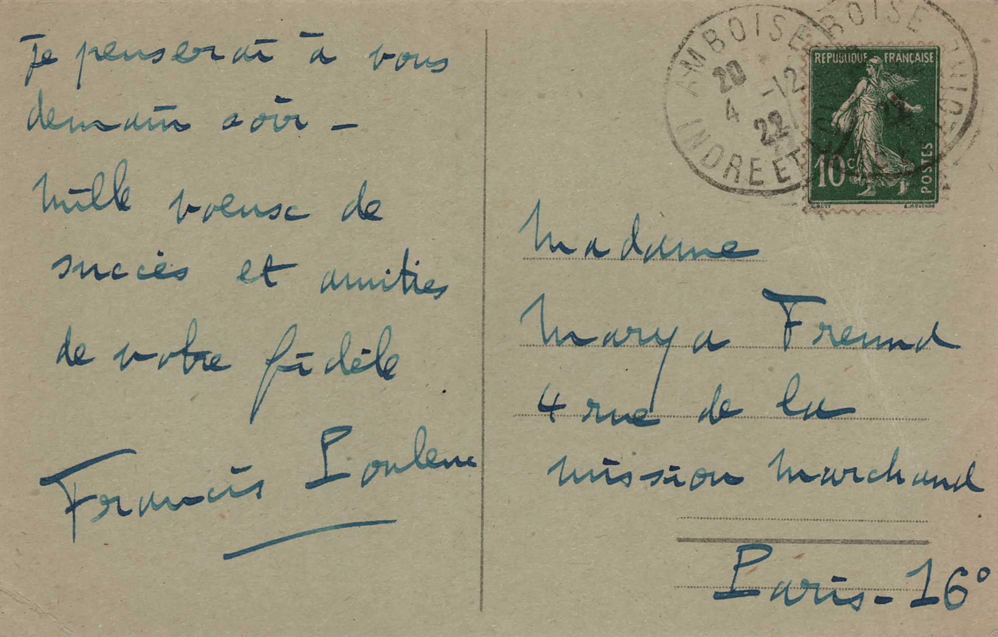 Renowned French composer (1899-1963) best known for his colorful, energetic keyboard works, art songs, and choral music. ALS in French, signed "Francis Poulenc," one page on a 5.5 x 3.5 postcard, December 4, 1922. Untranslated handwritten letter to the French soprano Marya Freund, penned on the reverse of a postcard depicting a panoramic view of the Amboise skyline. In fine condition.