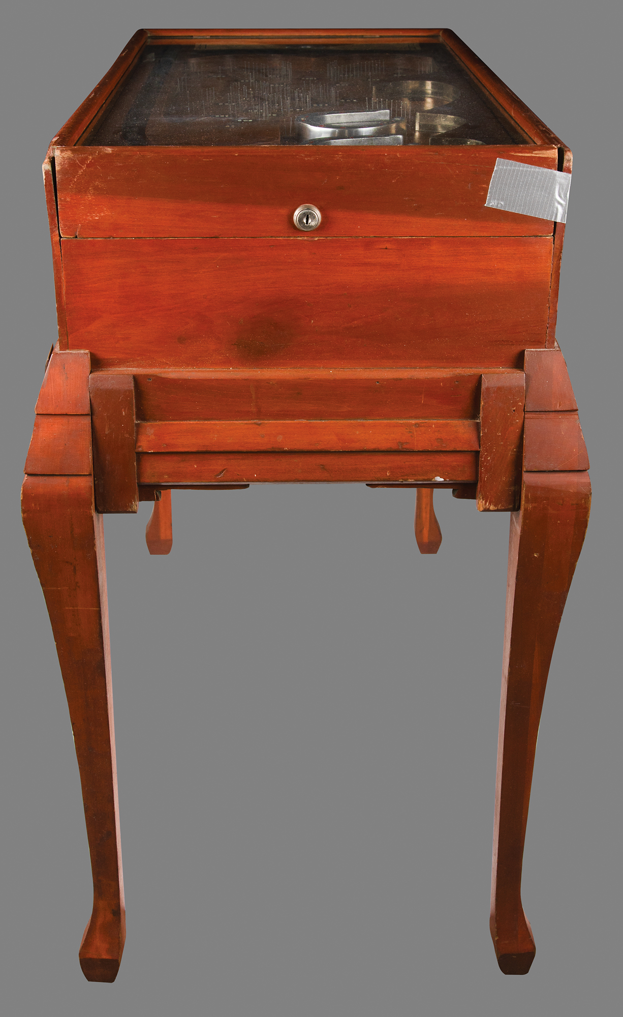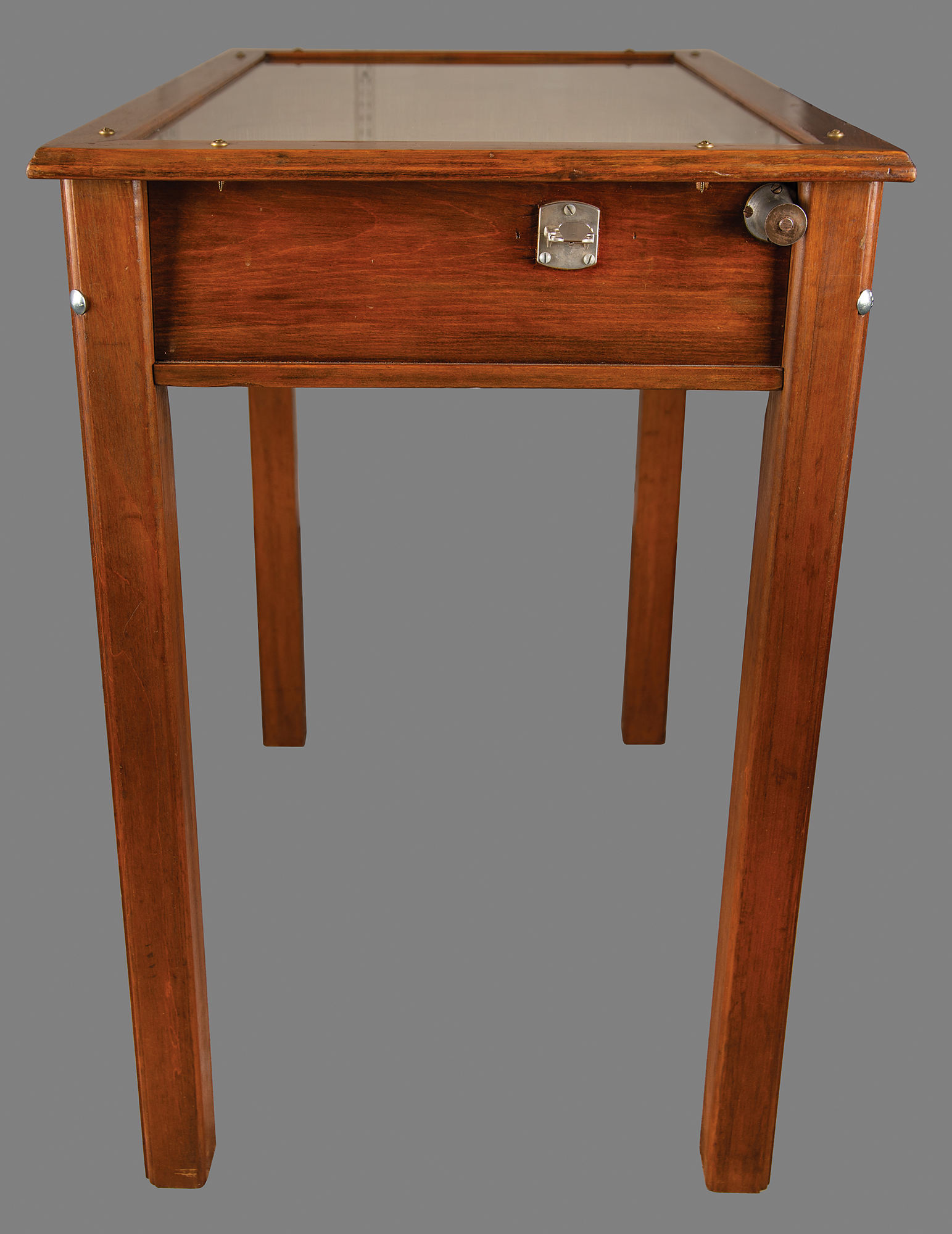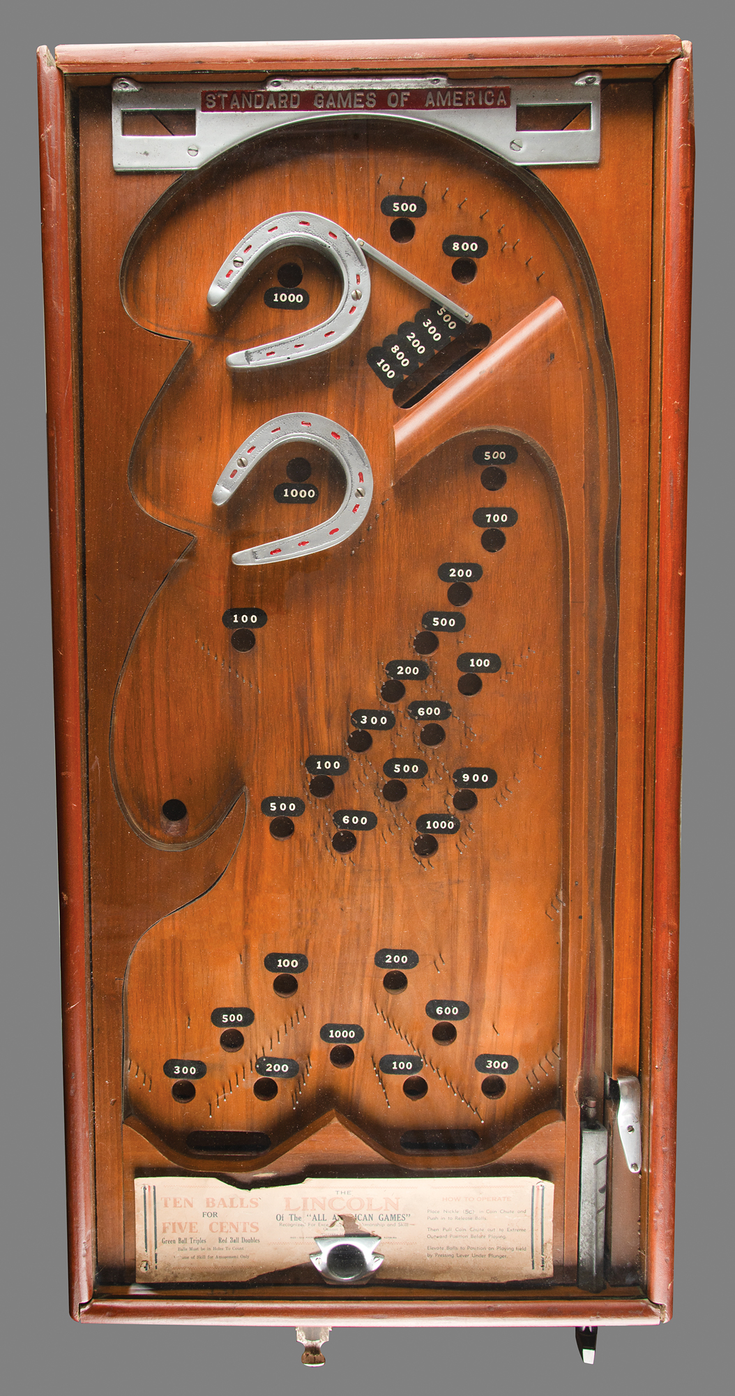 Exceedingly rare circa early 1930s Lincoln ‘pure mechanical’ pinball machine released by an unknown manufacturer at an unknown date, although the game title sheet to the bottom indicates a year, “1925,” and a partial address, “10th Avenue South…[Birmingha]m, Alabama,” and the upper playing field features a metal plate with possible manufacturer’s name, “Standard Games of America.” The tabletop machine, 23.5˝ x 44.25˝, and standing 40.5˝ tall, is comprised of its original wooden cabinet with a glass top, through which the player can observe the impressively carved playfield layout with two metal horseshoe designs and over 30 scoring options ranging from 100 to 1000 points. The bottom game sheet reads, in part: “Ten Balls for Five Cents / Green Ball Triples / Red Ball Doubles / Balls Must be in Holes to Count / A Game of Skill for Amusement Only…The Lincoln of the ‘All American Games / Recognized for Excellence [in Wor]kmanship and Skill / How to Operate / Place Nickel (5c) in Coin Chute and Push in to Release Balls. / Then Pull Coin Chute out to Extreme Outward Position Before Playing. / Elevate Balls to Position on Playing field by Pressing Lever Under Plunger.” In very good to fine condition, with paper loss to game sheet, scattered wear and marks, and some edges held together with duct tape. An obscure early pinball machine that appears to be, as research suggests, one of a kind.