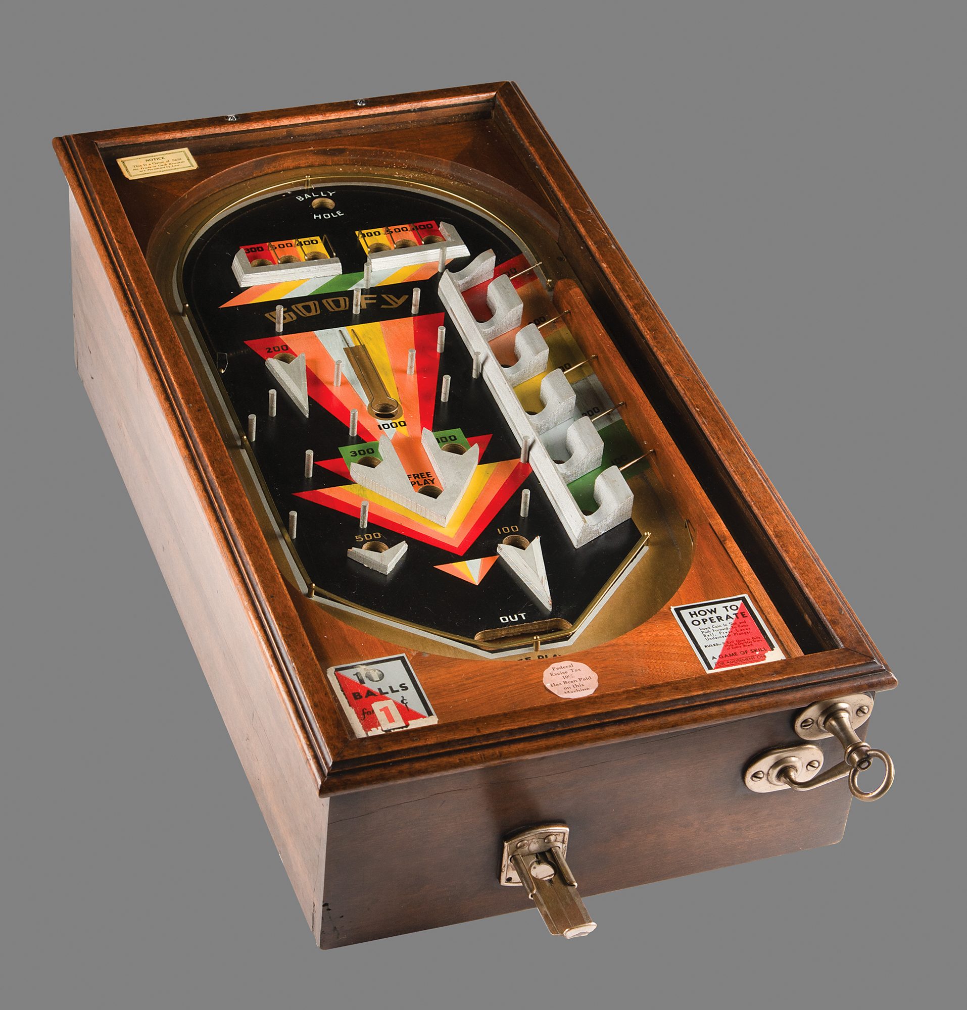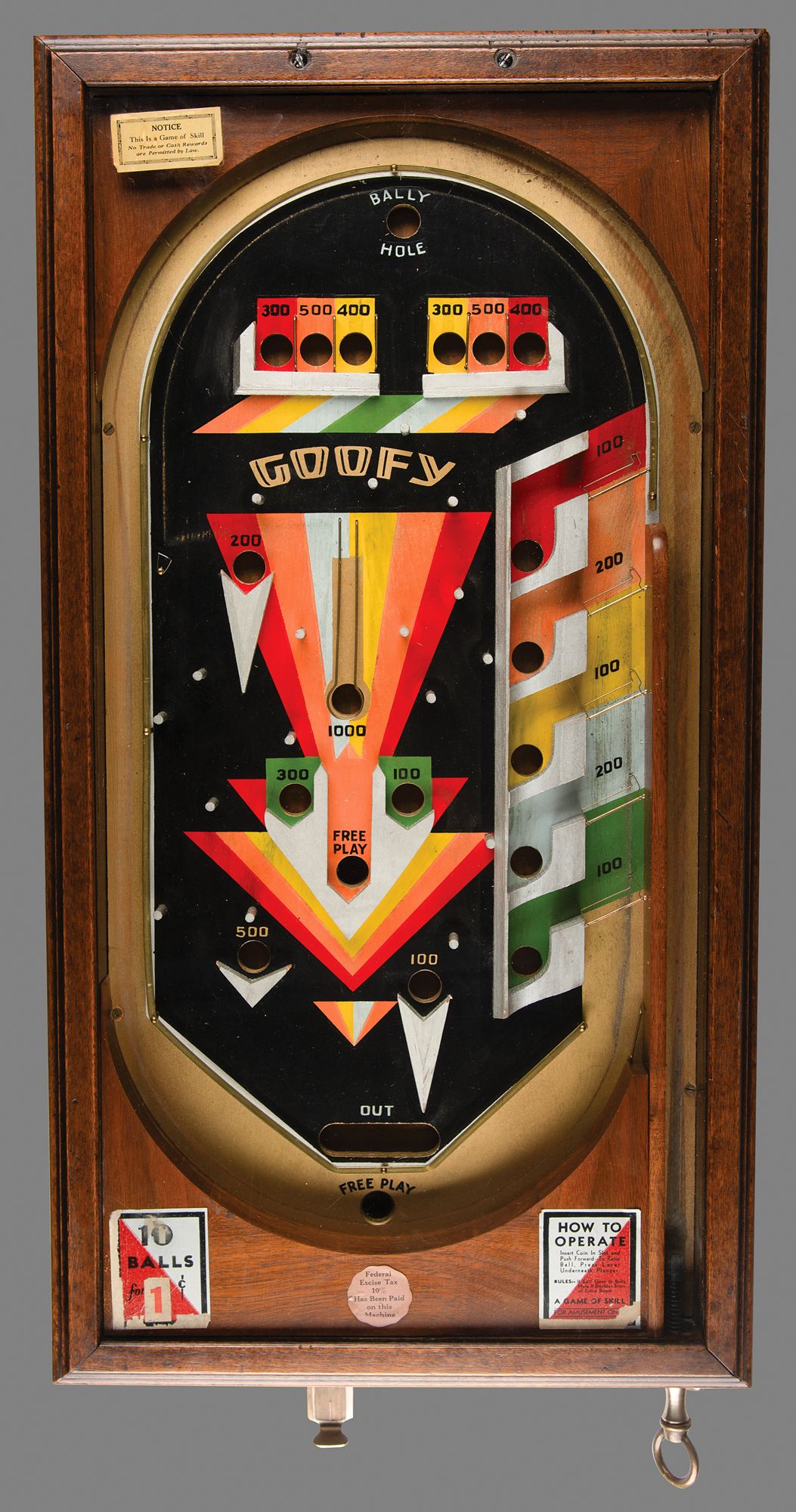 Original Goofy (Senior) ‘pure mechanical’ pinball machine released by the Bally Manufacturing Corporation circa October 1932. The tabletop machine, 16.25˝ x 33.5˝ x 9˝, is comprised of its original wooden cabinet with a glass top, through which the player can observe the colorful playfield layout with arrow design patterns and 19 scoring options ranging from 100 to 1000 points, which includes an upper “Bally Hole.” The lower portion bears an “Out” gobble hole and a “Free Play” hole. The cabinet bears a ‘How to Operate’ label, a “10 Balls for 1¢” label, a sticker indicating that “Federal Excise Tax 10% Has Been Paid on this Machine,” and a golden “This Is a Game of Skill” notice sticker to the upper glass. The rear of the cabinet is marked “DY.” Includes its original coin door key and a set of 10 pinballs. In fine condition, with some wear to the labels. A gorgeous Depression-era pinball machine designed by Jack Firestone.