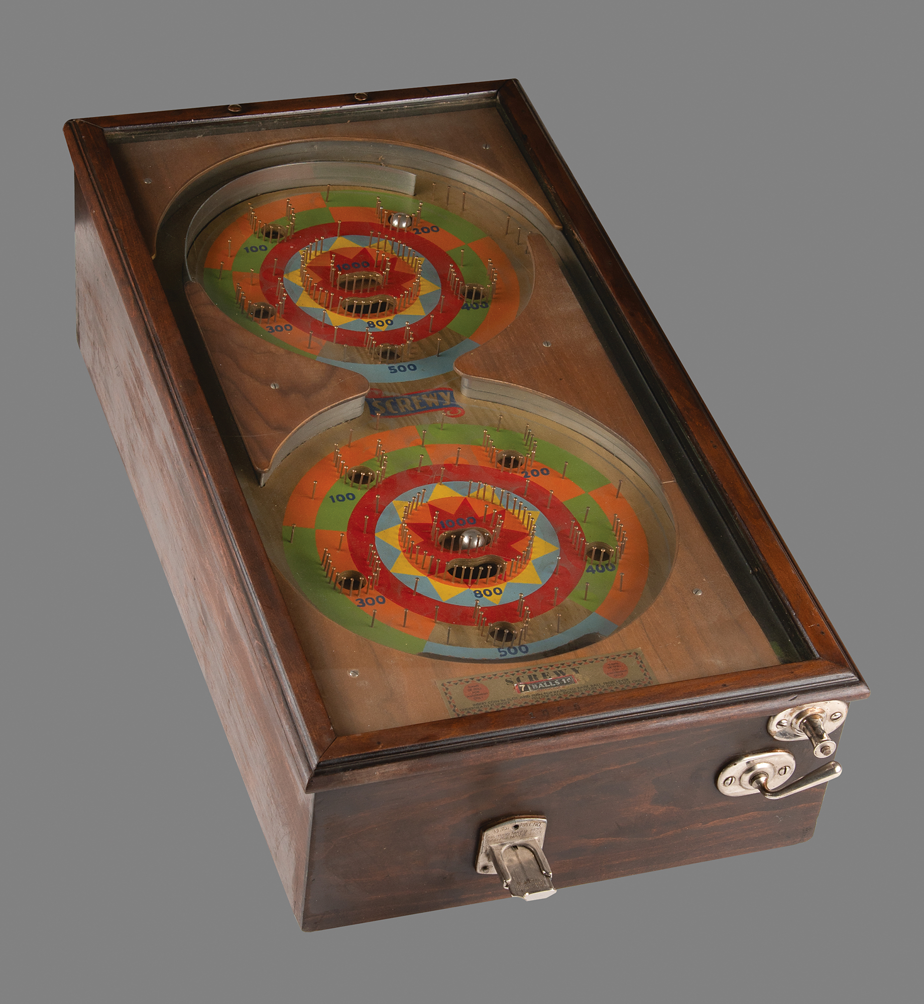 Original Screwy ‘pure mechanical’ pinball machine released by the Bally Manufacturing Corporation circa June 1932. The tabletop machine, 16.5˝ x 32˝ x 9˝, approximately 30 pounds, is comprised of its original wooden cabinet with a glass top, through which the player can observe the colorful ‘figure eight’ playfield layout, with matching scoring catches of 100, 200, 300, 400, 500, 800, and 1000 points. The game sheet to lower border reads: “SCREWY, Instructions / Insert coin in slot and push forward – to raise ball press lever underneath plunger / Rules – Yellow ball doubles score of that shot only.” Circles to either side read, “Game of Skill for Amusement Only,” and the sheet bears an affixed label: “7 Balls 1¢.” The top front edge of the frame is engraved, “1065,” and the coin slot is dated to May 1933. The coin door to cabinet rear is missing its key. In fine condition, with the plunger knob missing. When it was first released, Bally offered this game for $16.50 with an optional wood stand for $2.50 or a metal stand for $2.00. A beautiful Depression-era pinball machine designed by Bally founder Raymond Moloney.