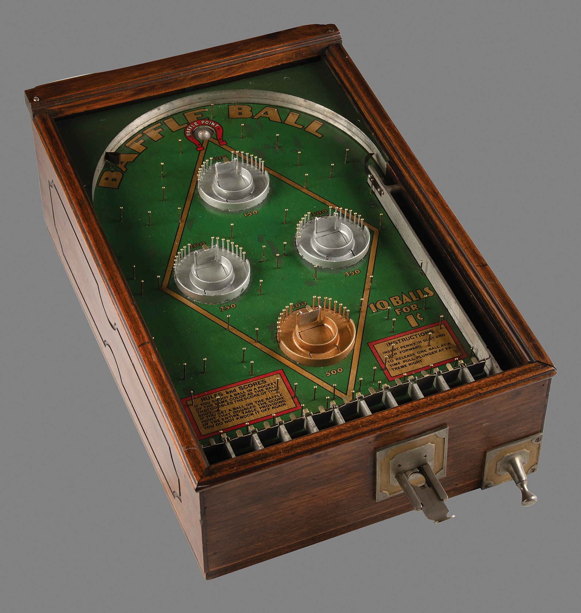 Original Baffle Ball ‘pure mechanical’ pinball machine released by D. Gottlieb & Company circa November 1931. The tabletop machine, 16˝ x 27˝ x 9˝, is comprised of its original wooden cabinet with a glass top, through which the player can observe the attractive playfield layout with a baseball-inspired design that features numerous bumper pins, 11 bottom point gates (from 5 to 50 possible points), four major scoring pockets of 150, 250, 350, and 500 points, and an upper ‘Baffle Point’ pocket, which, per the scoring rules below, “doubles the score of the entire table providing you do not knock it off again.” The lower right notes “10 Balls for 1¢” and the game’s instructions. The rear cabinet door retains its original key. In fine condition, with some light wear to cabinet. An attractive Depression-era machine designed by pinball pioneer David Gottlieb.