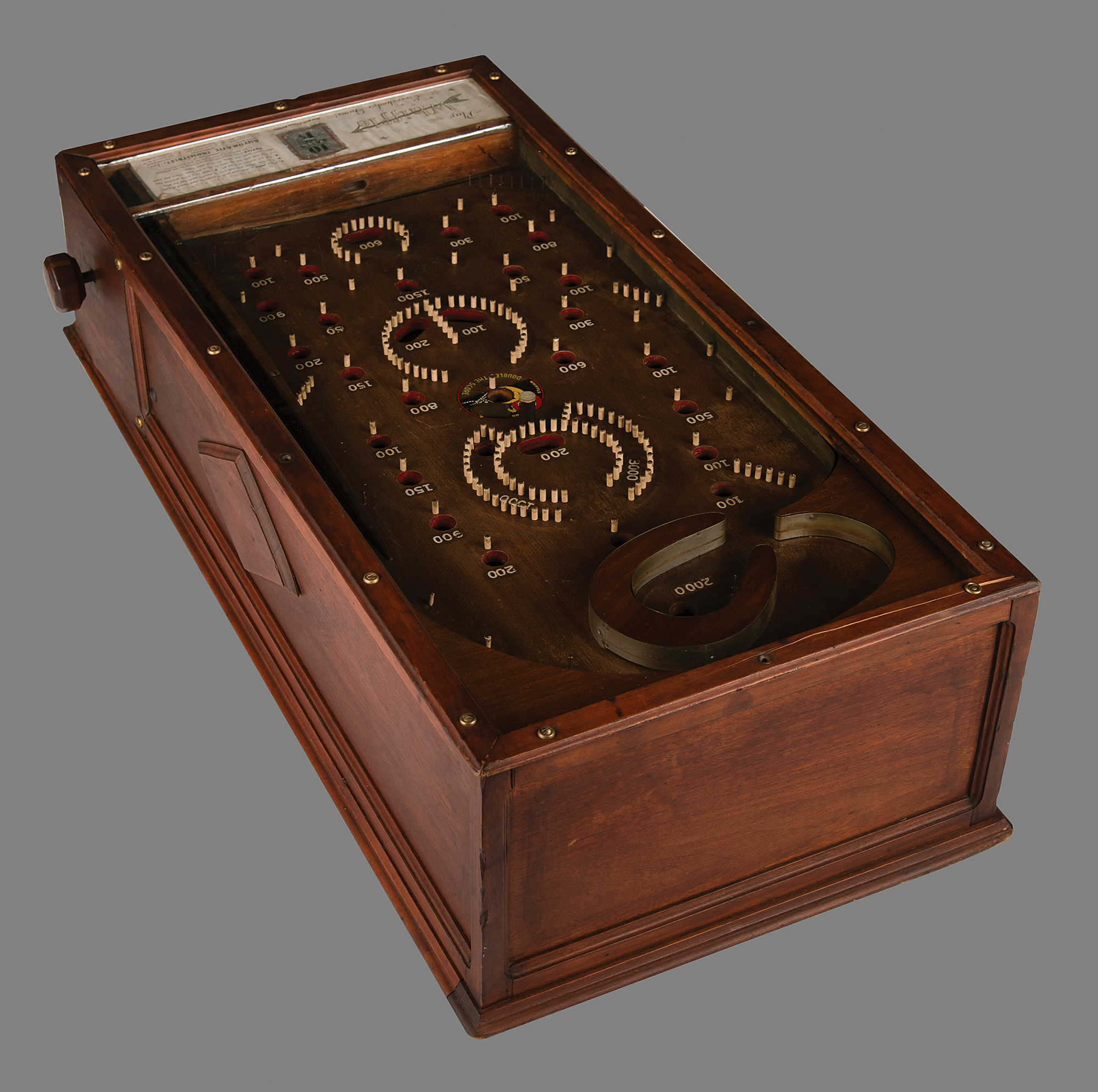 Incredible, historic original Whiffle ‘pure mechanical’ pinball machine released by Automatic Industries, Inc., circa June 1931. Conceived by Arthur L. Paulin, a carpenter from Youngstown, Ohio, and designed by Paulin and his friend, Earl Froom, an electrical salesman, the Whiffle has long been touted as the first American coin-operated pinball machine. The tabletop machine, 18˝ x 38˝ x 10.25˝, is comprised of its original wooden cabinet with a glass top, through which the player can observe the playfield layout with upper horseshoe design, a multitude of bumper pegs, and a total of 32 scoring options ranging from 50 points to 3000 points, which includes a central ‘Double the Score’ hole with colorful ‘Whiffle Bird’ emblem. The game’s title sheet reads: “Play Whiffle, Everybody’s Game! Directions for Playing: 1. Place nickel [“penny” in an unknown hand] in slide and push in slowly to clear board of balls. 2. Turn side-wheel one-half turn to elevate each ball for play. 3. Pull out shooter and let go. With very little practice you will find that you will be able to place the balls where you want them, very much the same as on a pool table. NOTICE – The lessors will not be responsible for any gambling on this game as it is leased only for your entertainment.” The sheet bears an affixed “10 Balls for 1¢” label and the lower portion lists manufacturing and office locations in Kansas City, Missouri, Youngstown, Ohio, and Toronto, Ontario, Canada. In fine condition, with some dampstaining to the game sheet, a few missing cabinet screws, and several pins without their white rubber guards, with one or two cracked. Bidder notice: the game should not be played unless the fragile rubber pin guards are replaced.