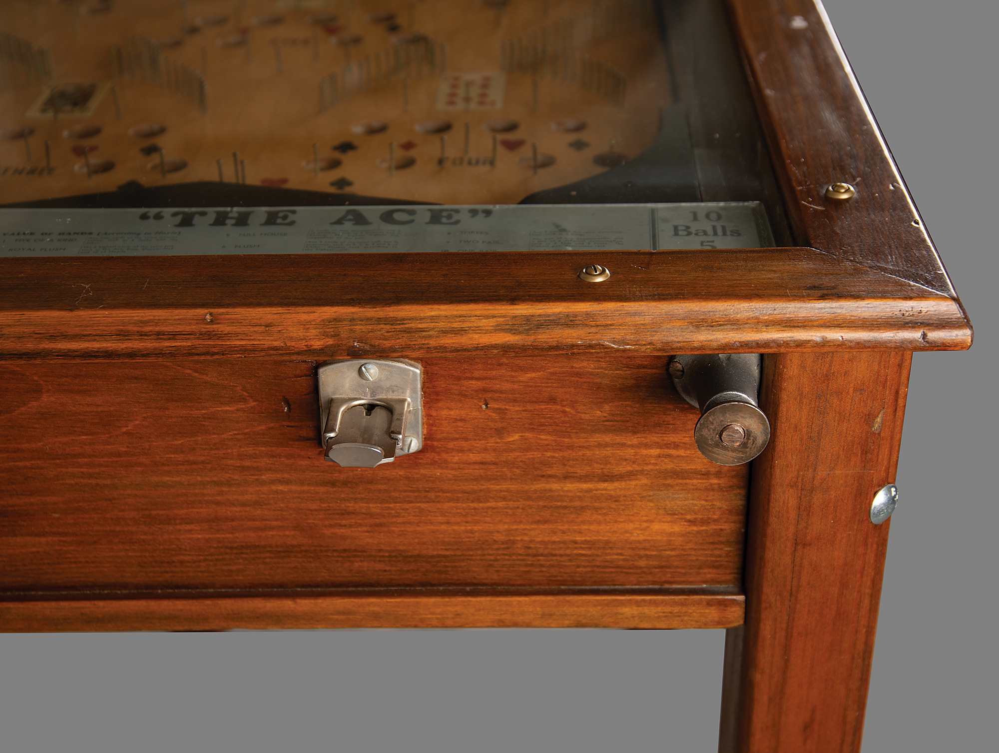 Original circa early 1930s The Ace ‘pure mechanical’ pinball machine released by the Northwestern Distributing Co., of Milwaukee, Wisconsin, at an unknown date. The tabletop machine, 26.5˝ x 43.25˝, and standing 41˝ tall, is comprised of its original wooden cabinet with a glass top, through which the player can observe the appealing playfield layout with card game designs and 52 scoring combinations, which includes four suit holes for all numeral cards (1-10), court cards, and pip card (Ace), with the upper section also featuring a single Joker hole. The bottom game sheet reads, in part: “To Operate / Insert 5c in coin slot and push plunger all the way in to release balls. Raise one ball at a time, with knob on the right hand side of table. / The LESSORS will not be responsible for any gambling on this game, as it is a game of skill, and leased only for your entertainment…10 Balls, 5 Cents.” The central section of the game sheet lists the 11 ways a player can score: Five of a Kind, Royal Flush, Straight Flush, Four of a Kind, Full House, Flush, Straight, Threes, Two Pair, One Pair, and High Card. Includes a few original playing balls. In very good to fine condition, with some scattered marks and wear. A clever union of arcade and casino entertainment and a unique artifact of Depression-era gaming.